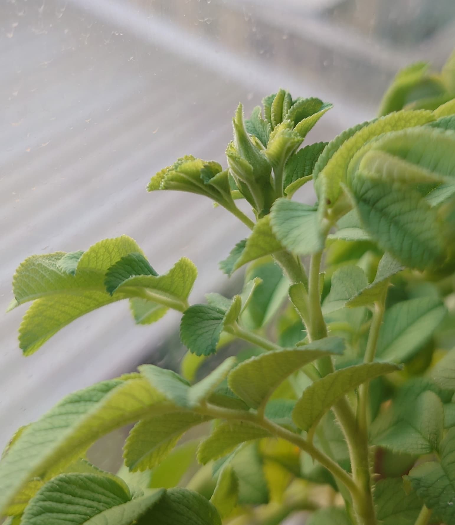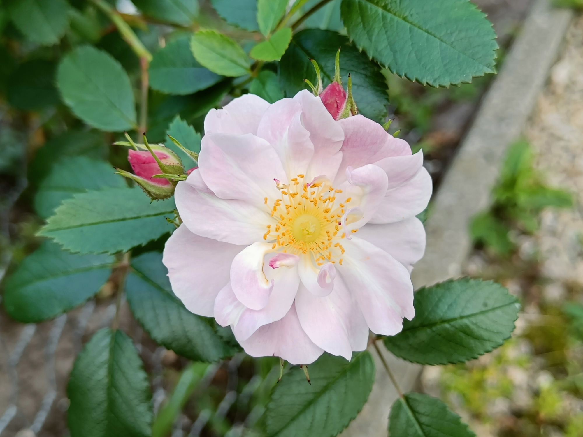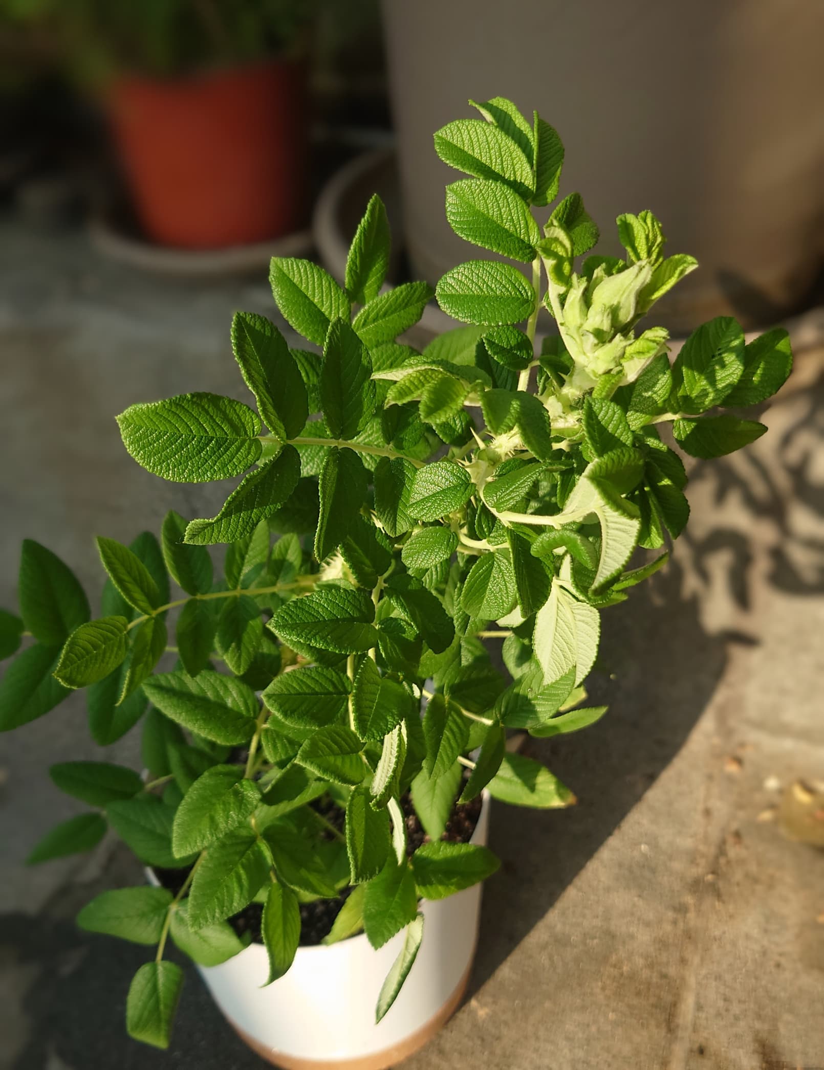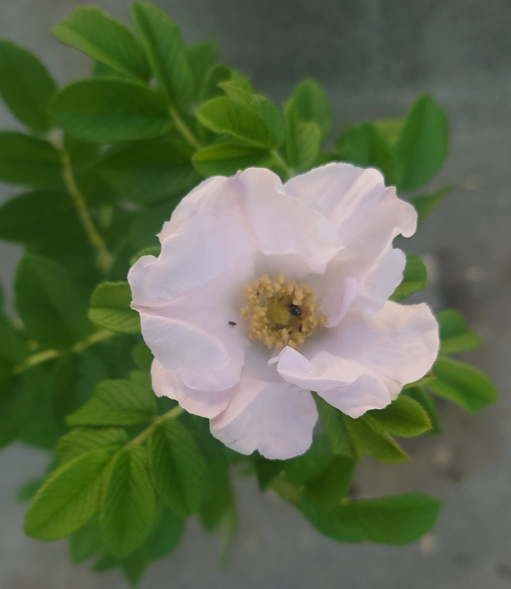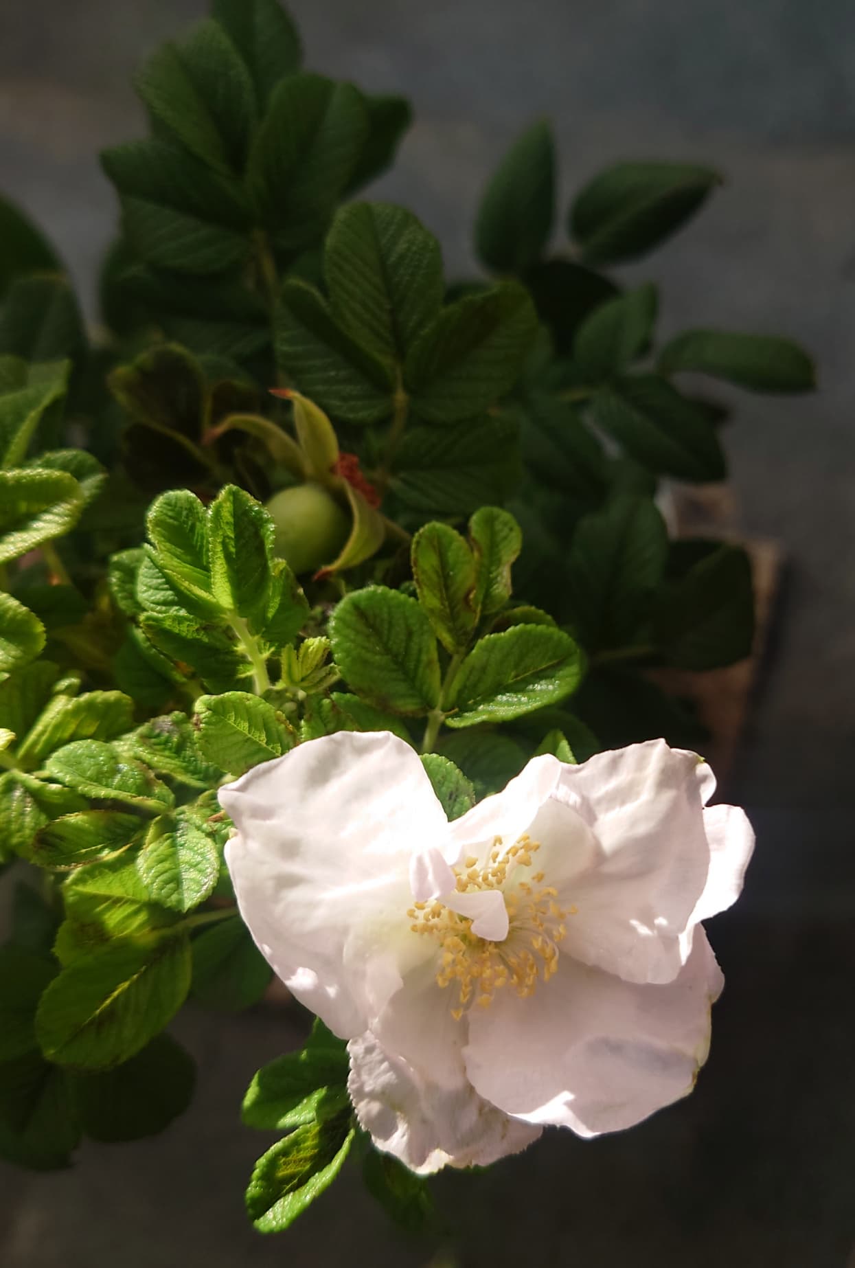In 2023 I’ve used Schneezwerg again, but as a pollenparent on a diploid musk rose with very good repeat-flowering. 264 seeds gave me 52 germinations, but the seedlings were prone to disease. Kept the 6 best and 3 of them flowered a few months later, the other 3 didn’t and I disposed of them. Of those 3 juvinile bloomers I only kept one after a check at the start of this year, the strongest. One of the weaker two suffered from frost and didn’t grow strong enough, the other one I disposed of had a really strange condition in wich every intersection of two nodes had some sort of corcky cellstructure. The whole plant, every joint of two nodes had it without exception. Some growing disorder I guess. So now in 2025 I have one very beautifull rose that is the perfect mix of the two parents. This is a picture. She has been moved to my trial plot and I’ll try her as a pollen parent (I don’t think she will set hips).