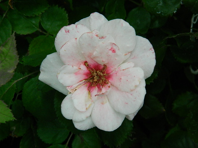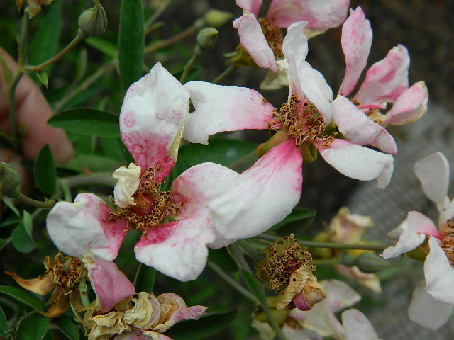 I thought to photograph the red eye on Rayon Butterfed. As they age, the red becomes very pronounced. There are hips already turning color of its pollen on one of the Hulthemia seedlings Jim shared with me.