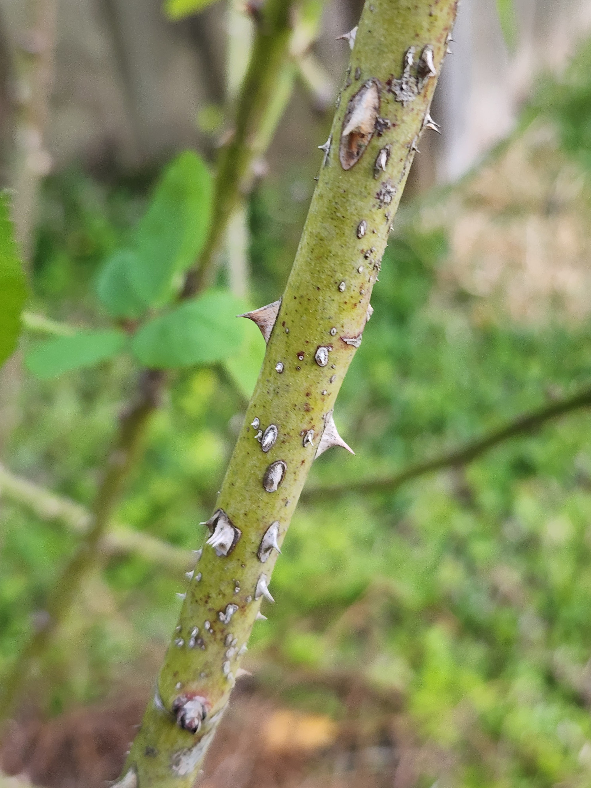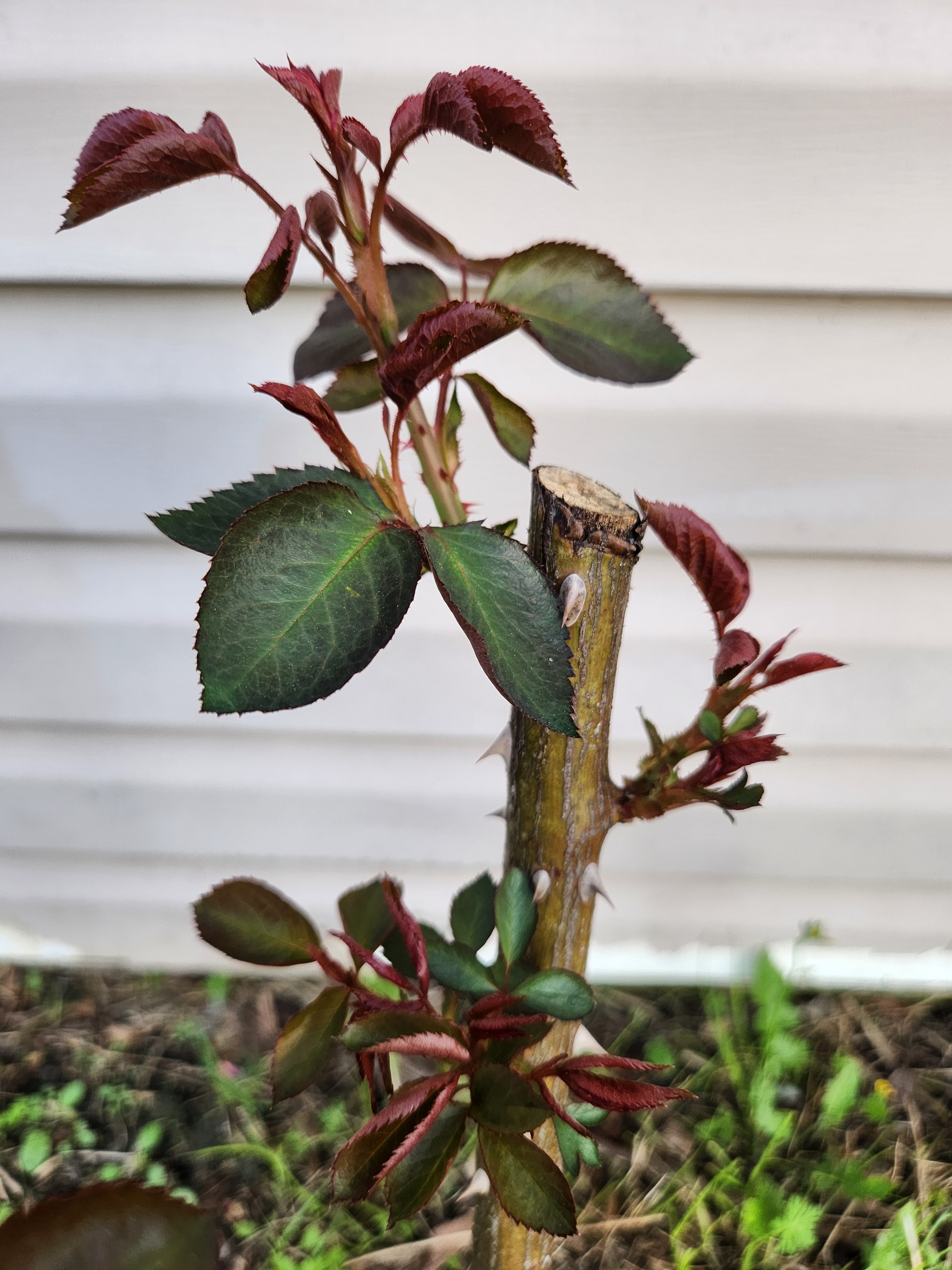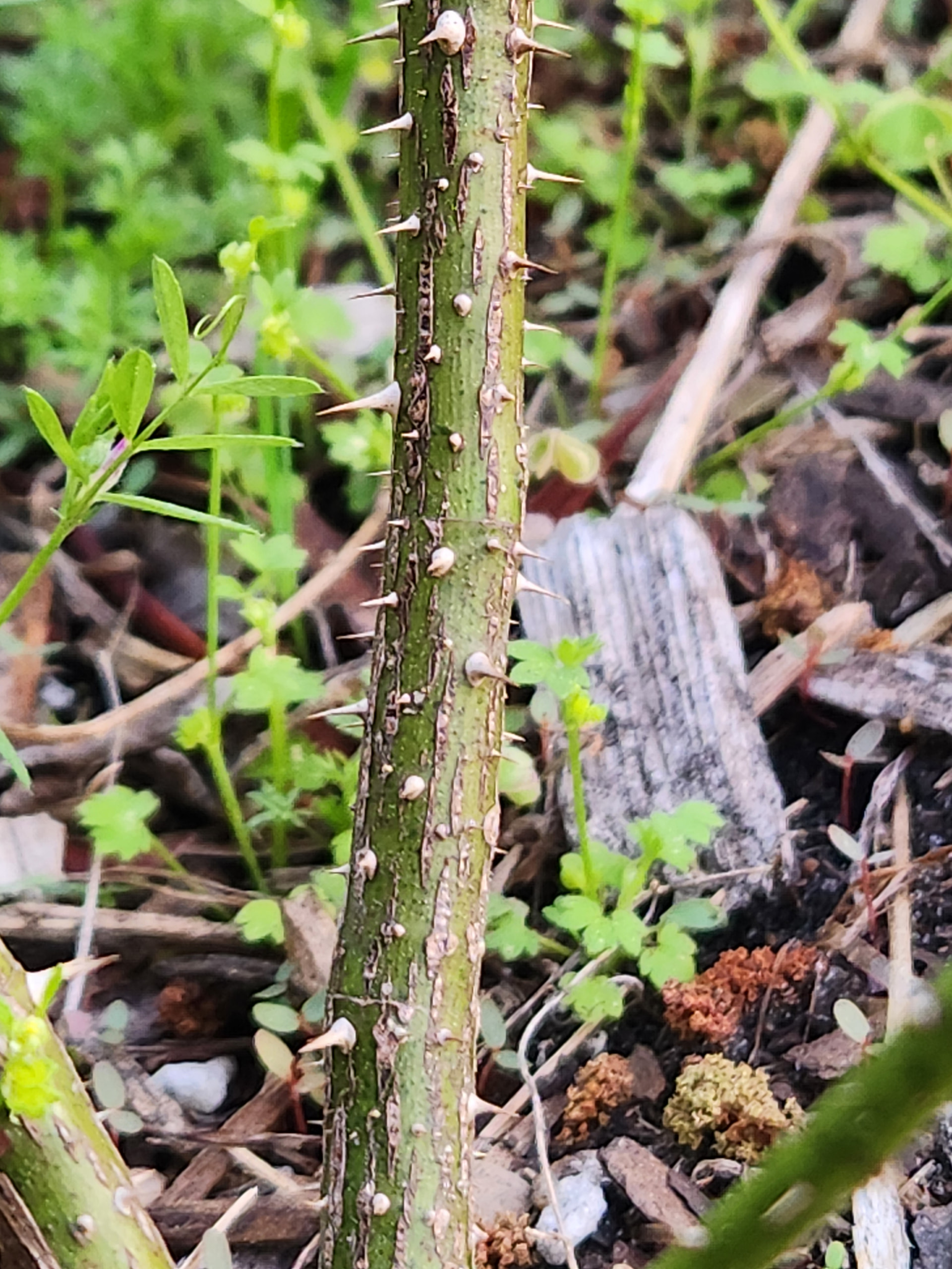 I am including thorns from my baron girod and R. Woodsii since I think they are the likely parents. Baron has the many different sized thorns trait vs the woosii that has dense straighter prickles at the base (my woodsii is mostly thornless). I would also think if the seedling has woodsii in it the stems might be more red.
