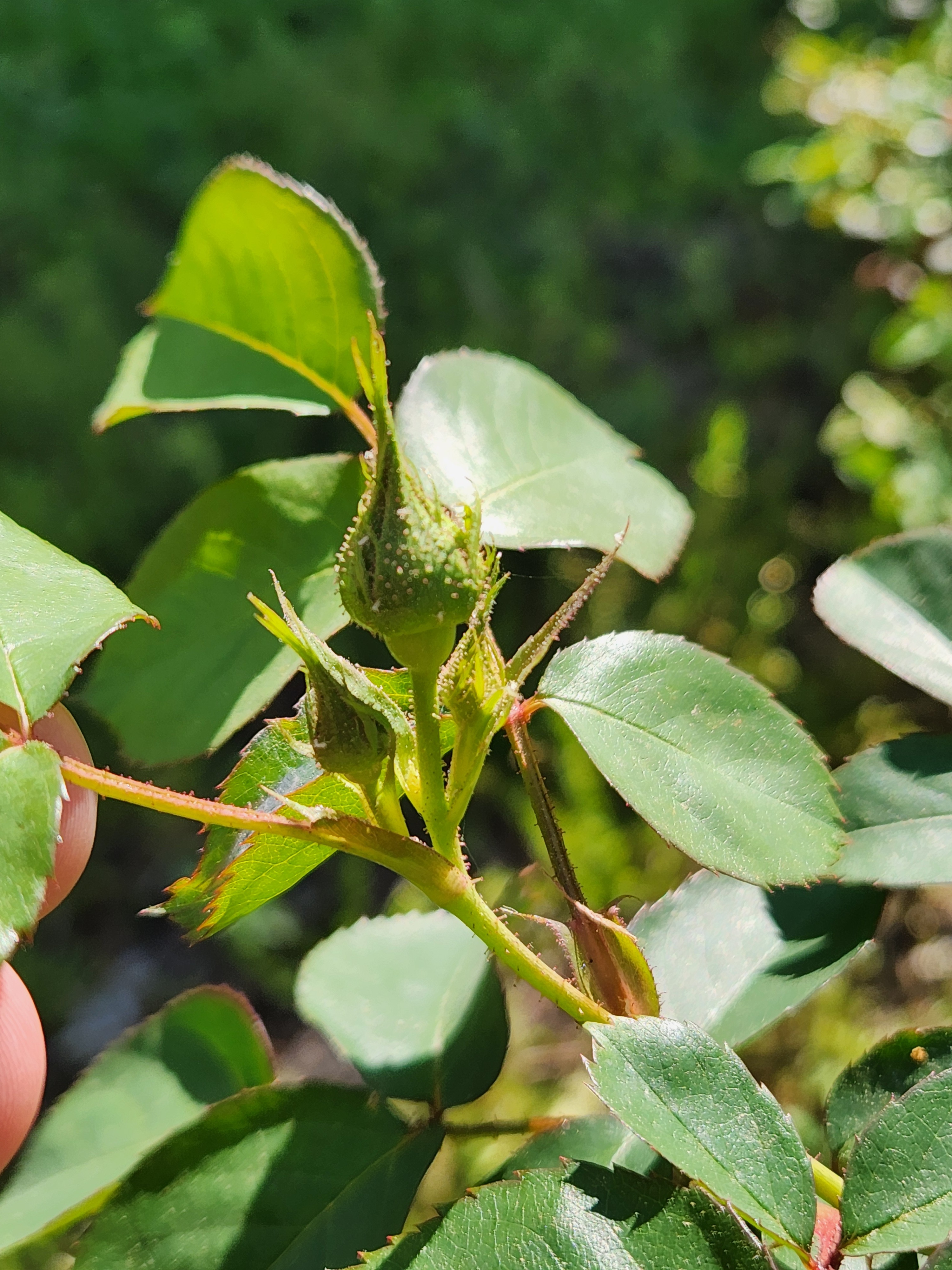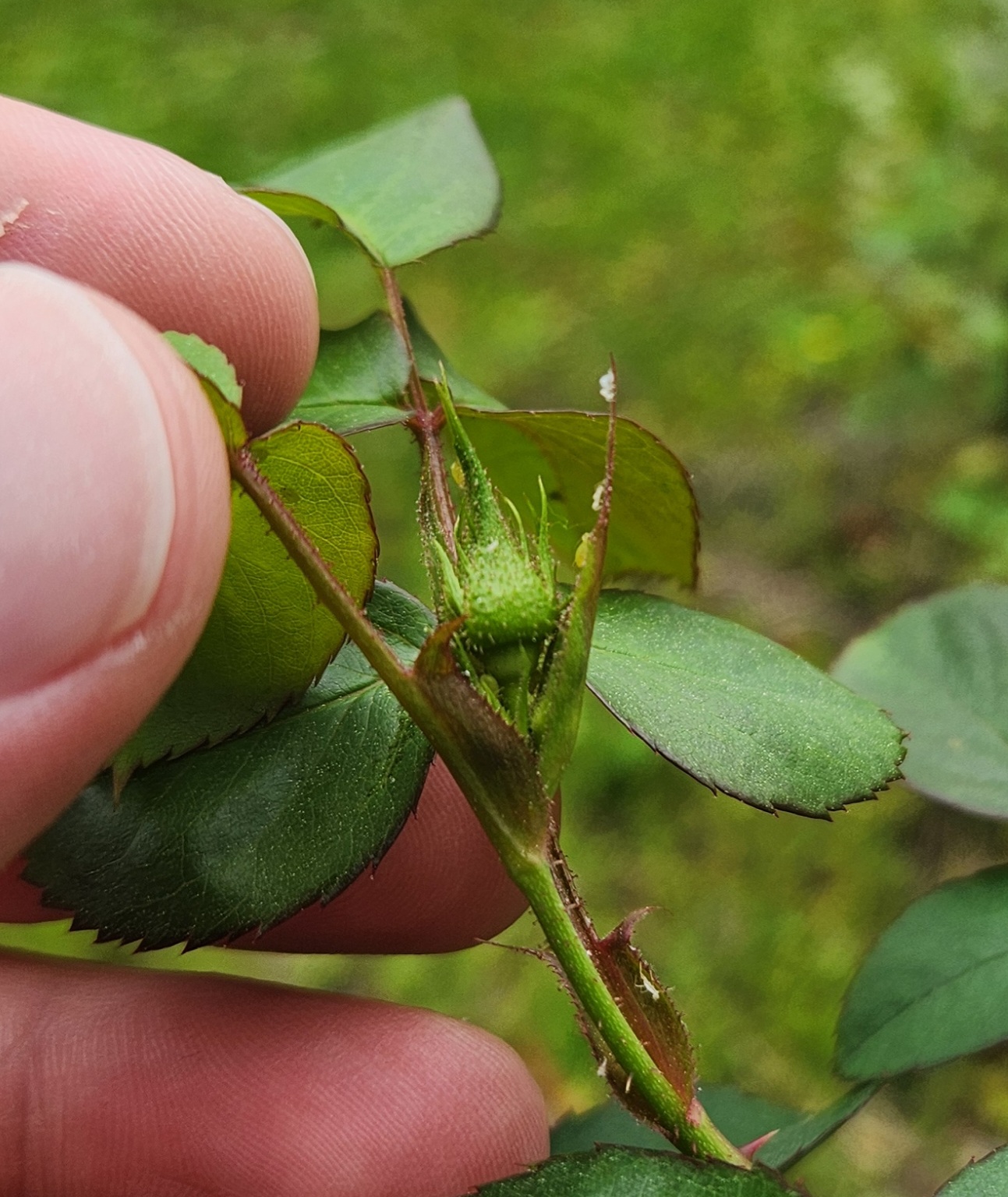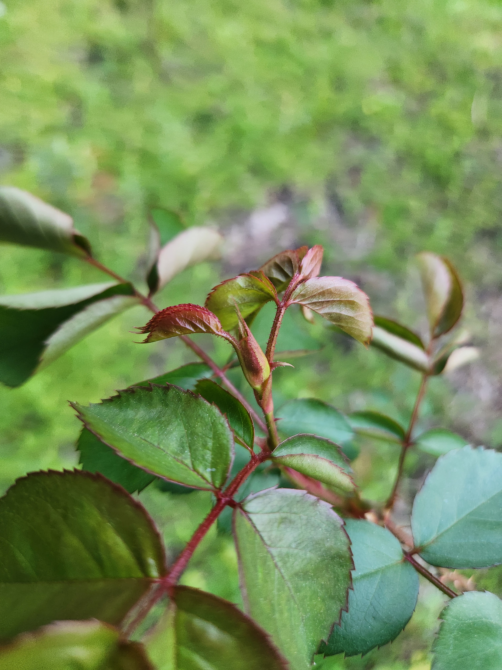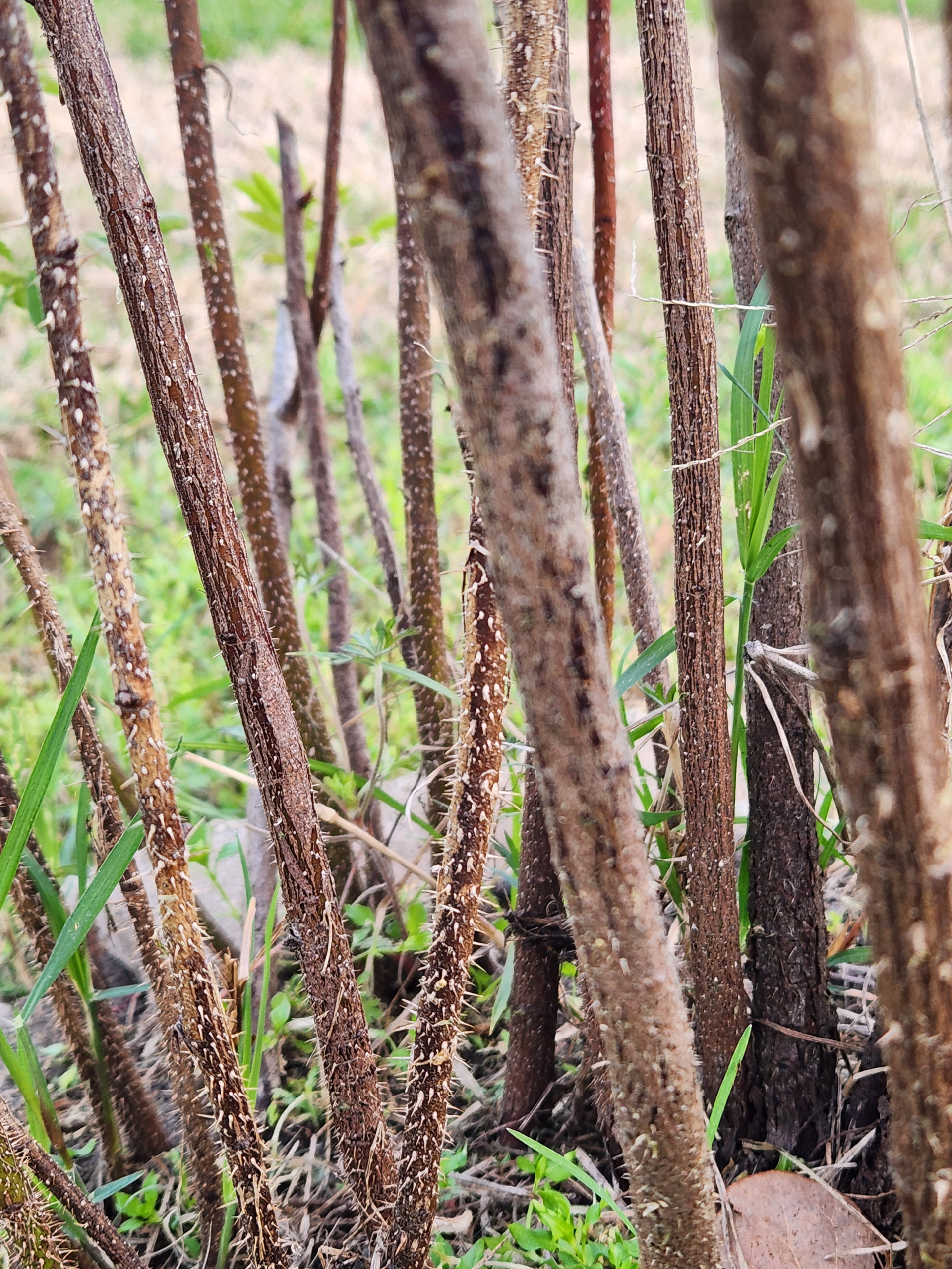 I am including thorns from my baron girod and R. Woodsii since I think they are the likely parents. Baron has the many different sized thorns trait vs the woosii that has dense straighter prickles at the base (my woodsii is mostly thornless). I would also think if the seedling has woodsii in it the stems might be more red.
