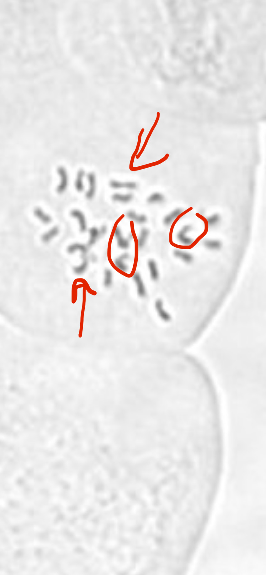 So I counted 25 dark blobs of various shapes, but about those shapes; the āvāās and a āwā(?), are they chromosomes actively replicating, to separate shortly and make 2 from one? Itās strangely like looking at an X-ray of a belly of puppies and trying to count spinesā¦