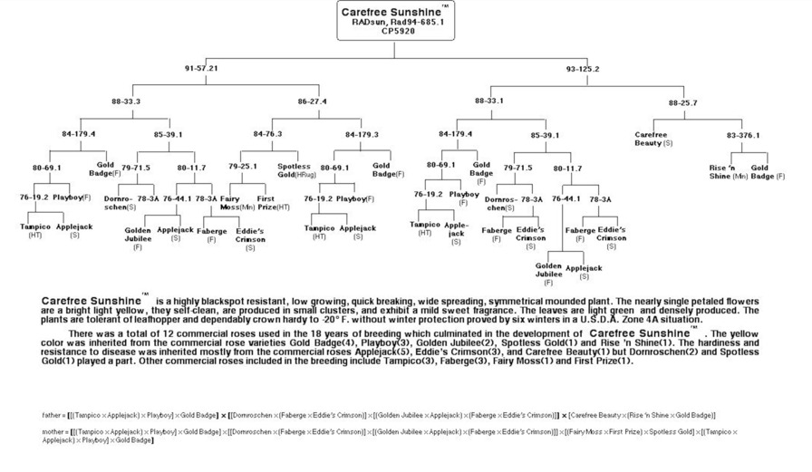 This doesnāt answer any of your questions, but since youāre talking about Carefree Sunshine I wanted to share this photo uploaded to HMF by Will Radler. I stumbled upon this when I first became interested in rose breeding and still find myself revisiting it because it truly is a celebration of the craft. The chart spans 18 years of crosses leading up to Carefree Sunshineās creation.