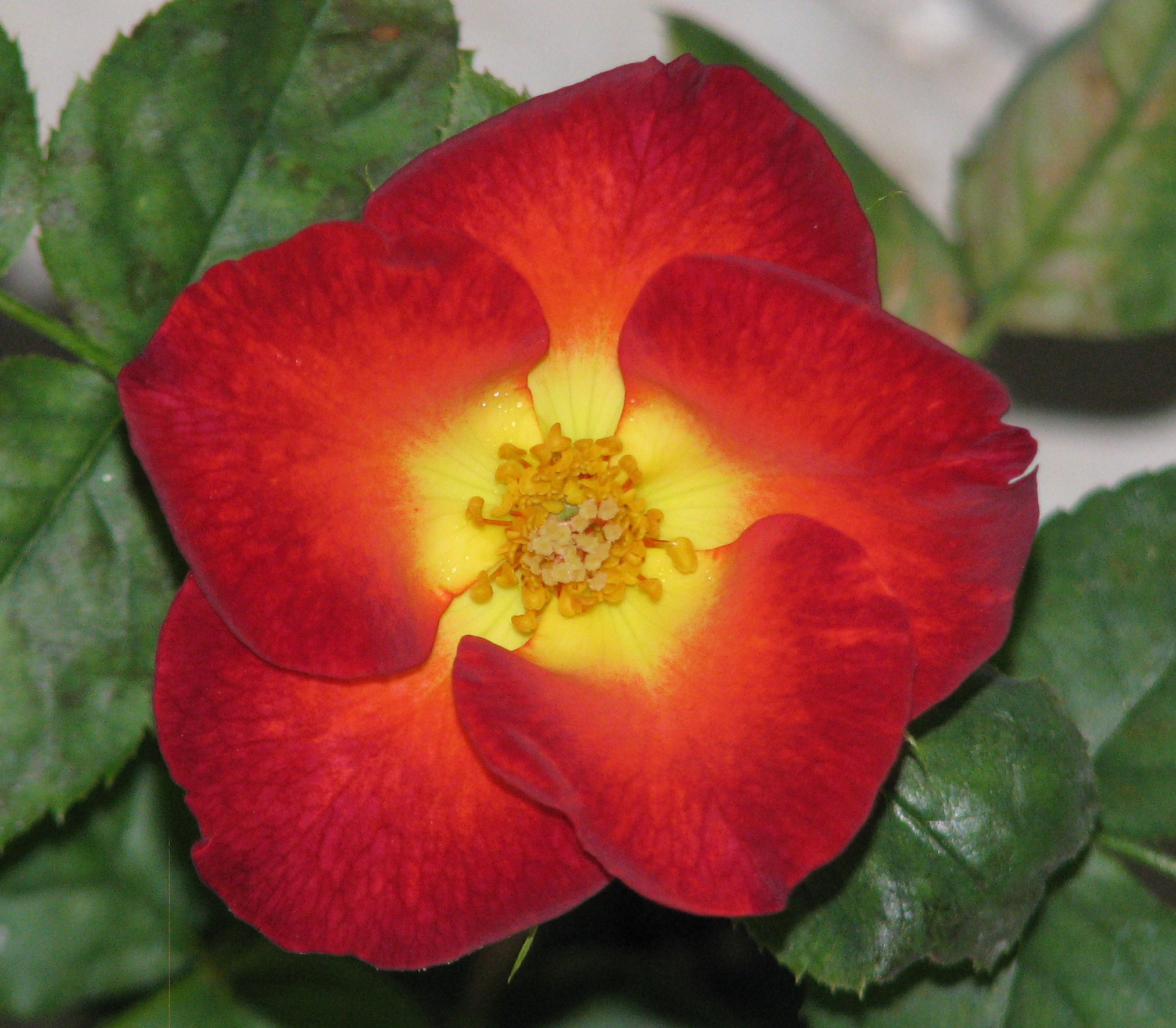 First bloom of Outta the Blue X Joyberry. Hard to tell from one flower, but it has characteristics of the pollen parent. It also has a very strong old rose scent like the pollen parent, not the spicy clove-like scent of the seed parent. Not the most jaw-dropping bloom, but the main goal of this cross was health, vigor, few thorns, and strong scent. So far so good. Thanks Kim for the pollen.