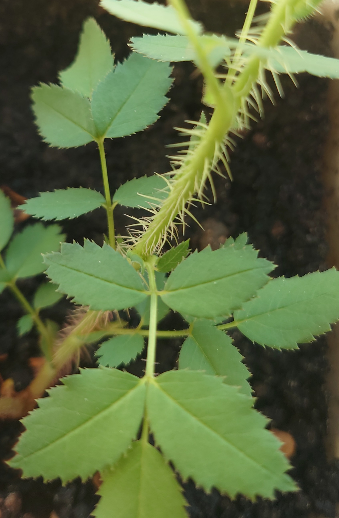 The stems are mostly thornless but not completely, and the remaining leaves appear to have five leaflets.