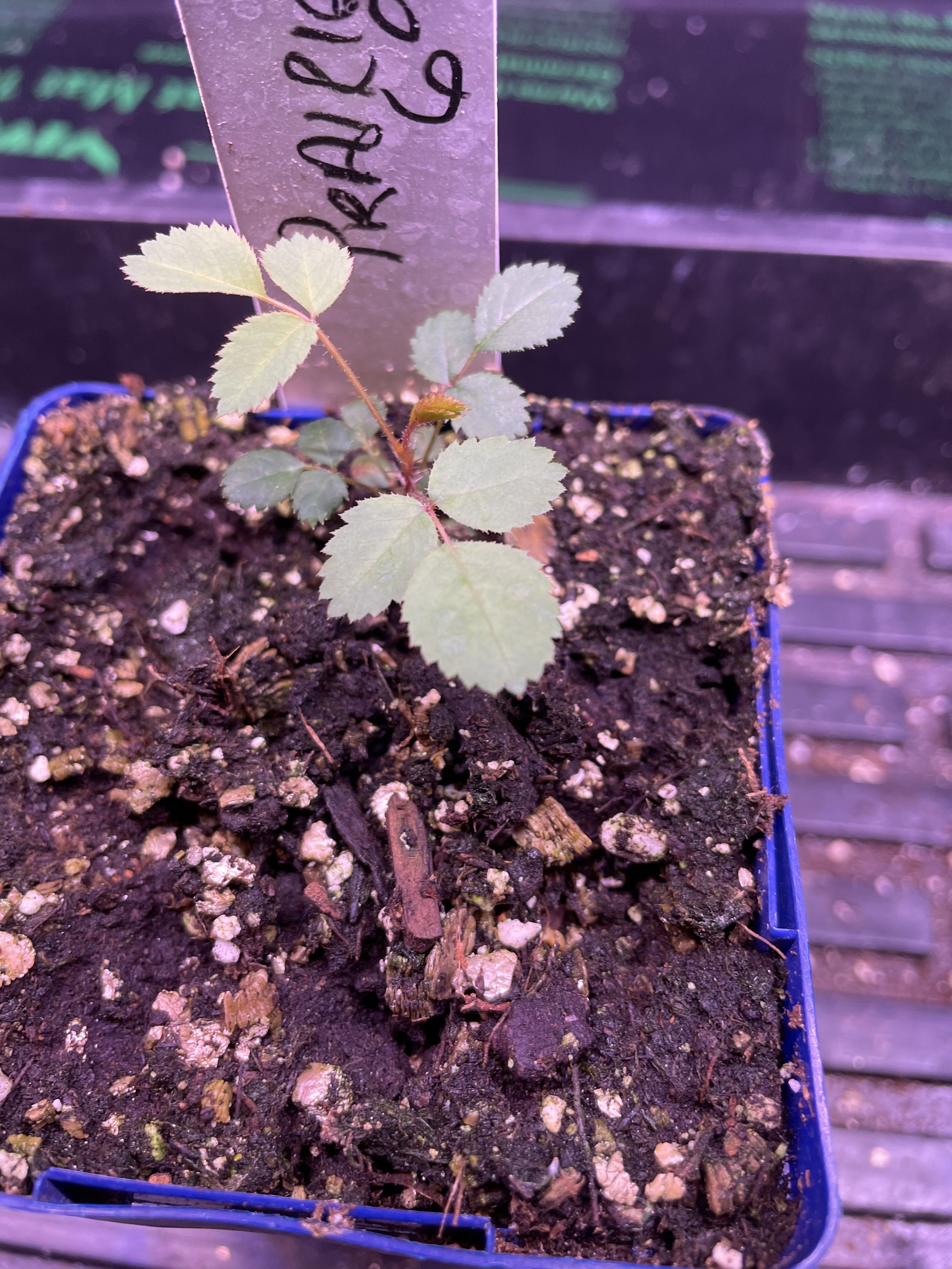A tiny 4 week old seedling is on its fifth set of 3 lob leaves. It looks like a rose, except tiny, and closely spaced leaf sets.
