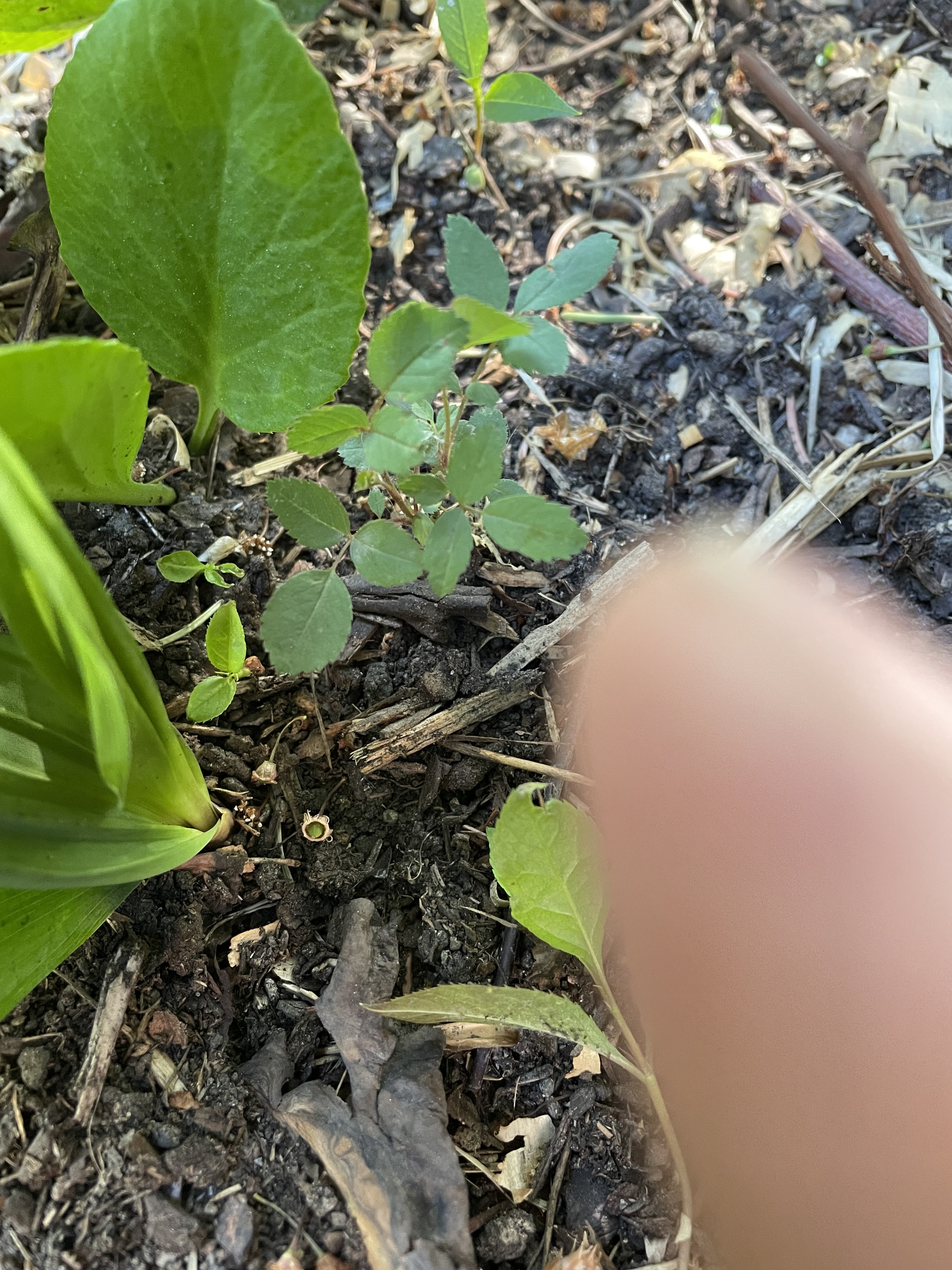 To further cement that 3 leaflets per leaf is common in seedlings (new learning for me from the intense world of micro observations when watching hoped for successful crossings develop); during morning gardens tour l found a seedling (volunteer) that is full of three leafs and maybe “ 3 inches high” among the lilies of the valley and bergina (hardy elephant ears).