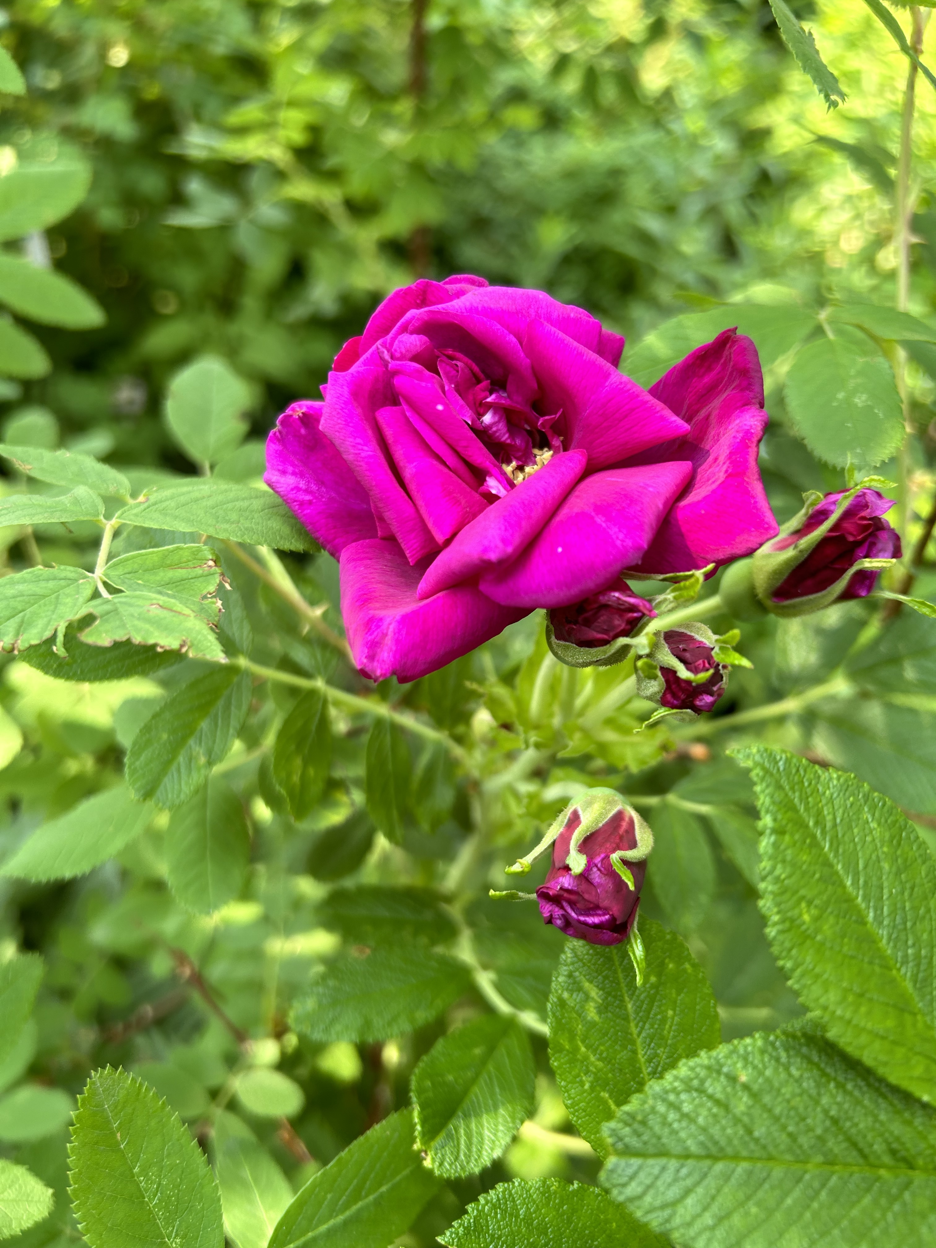 ID my mystery rose as Roseraire de L’Hay. Leaf form, bloom form, aging to magenta makes it a dead ringer for it, and leaves narrower than Hansa leaves and it hints of rugosa.