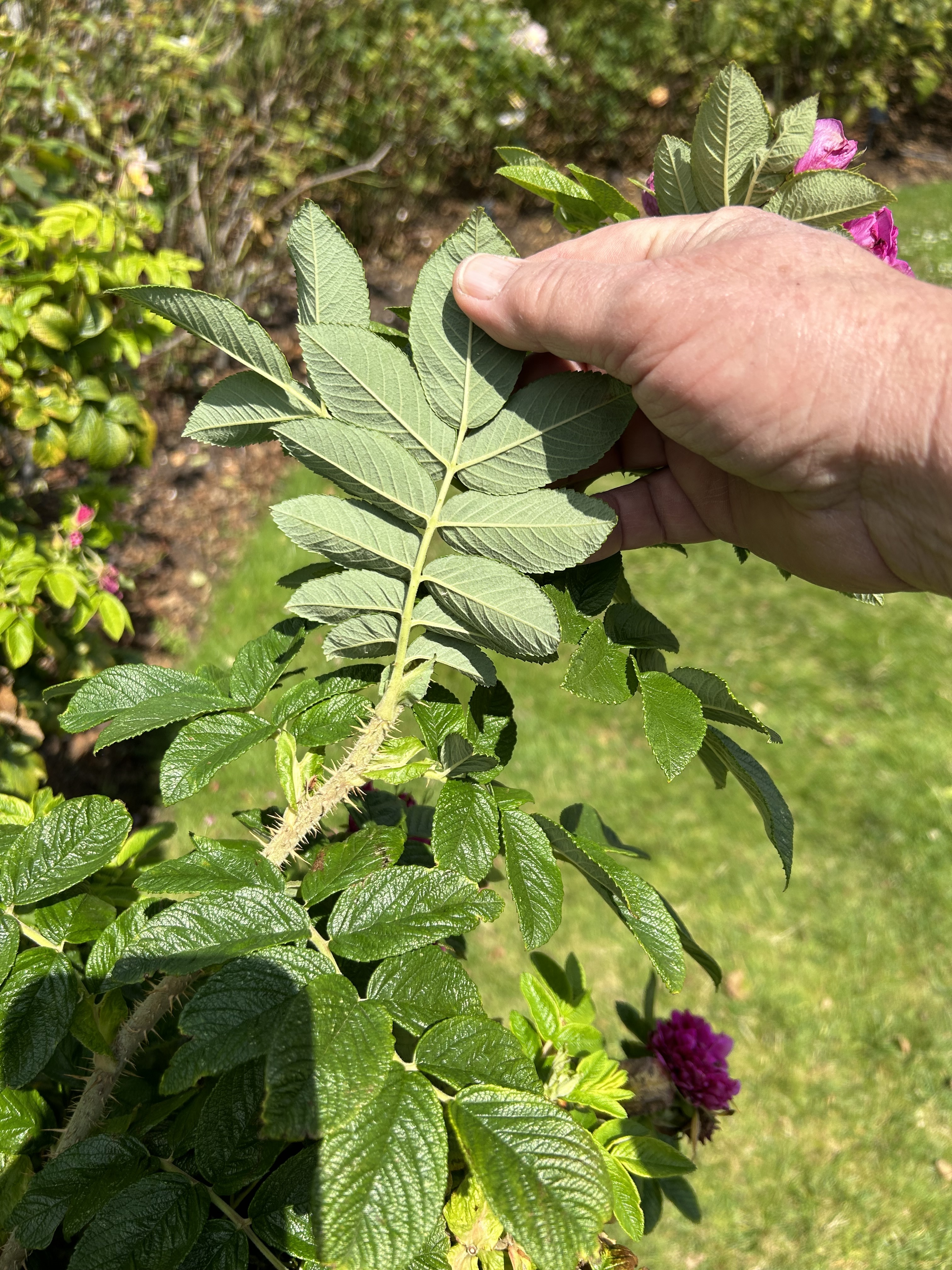 All marked Hansa’s (hedge size) at the Kew rose garden northish of Palm House do not appear to my eyes to have the Calgary Hansa “ Dark Flower “ narrower leaflet form.