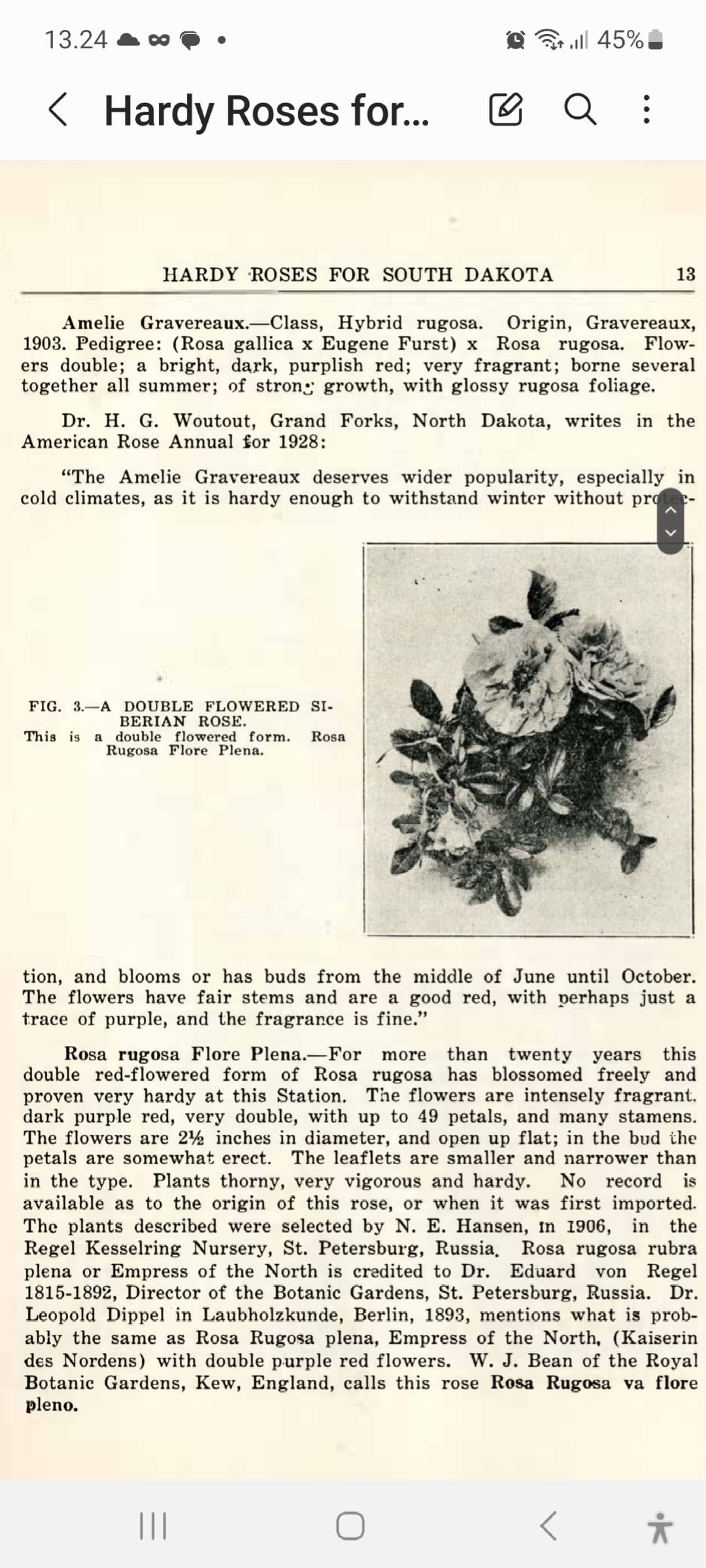 Odds are good R. rugosa flore pleno is in circulation on the prairies as Georges Bugnet used it in his early rose hybridizing efforts. In 1942 he notes “Hansa” as being located at the University of Alberta and in 1943 he shows crosses using “Rosa rugusa flore pleno”. Apparently he thought they were different cultivars. We also know Bugnet received seeds of Pinus sylvestris `Ladoga’ from Petrograd in 1917. He could have acquired Rugosa flore pleno seeds as well.