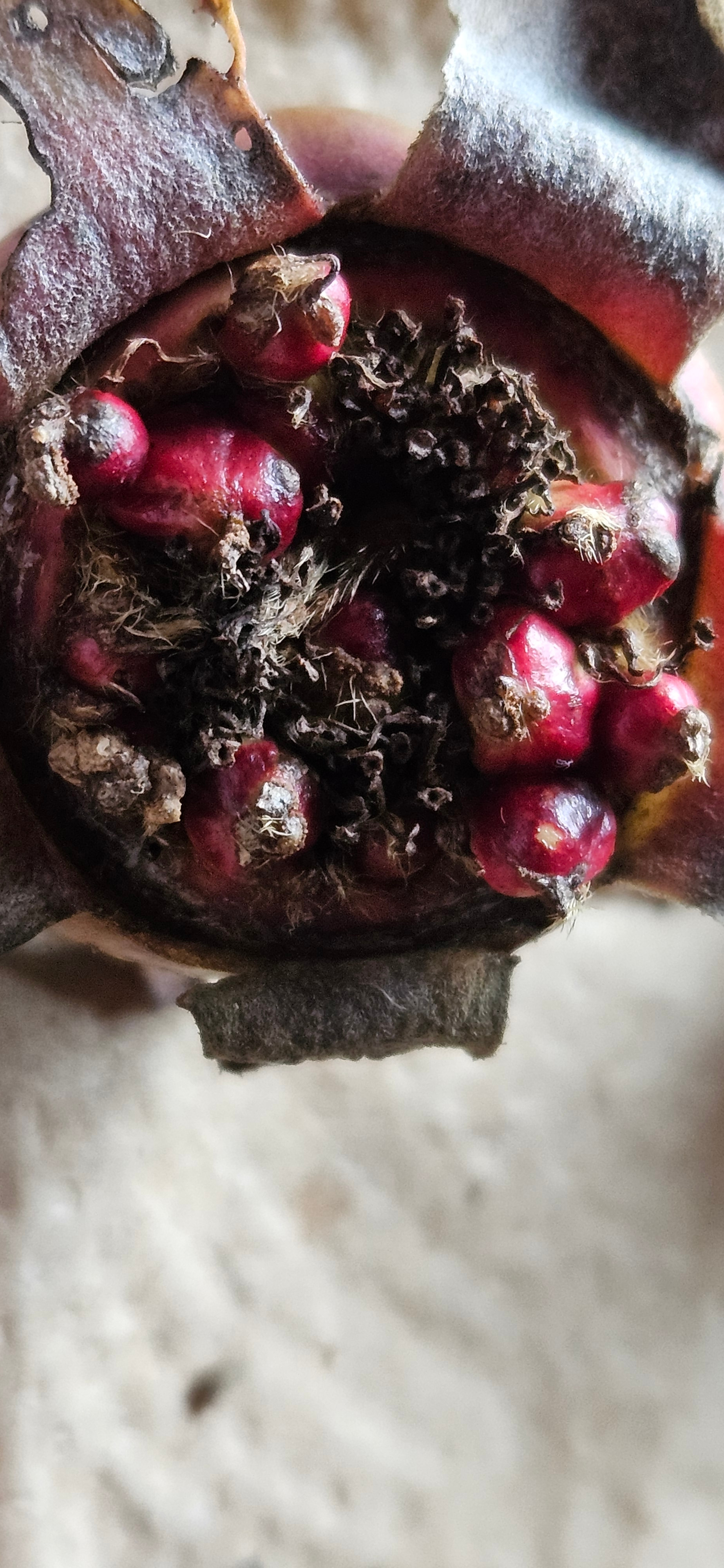 what are these, are they the hip seeds trying to germinate in the hip?? These are H.T. hips on Jan 22. Temps have been in hi20&30 for a couple wk