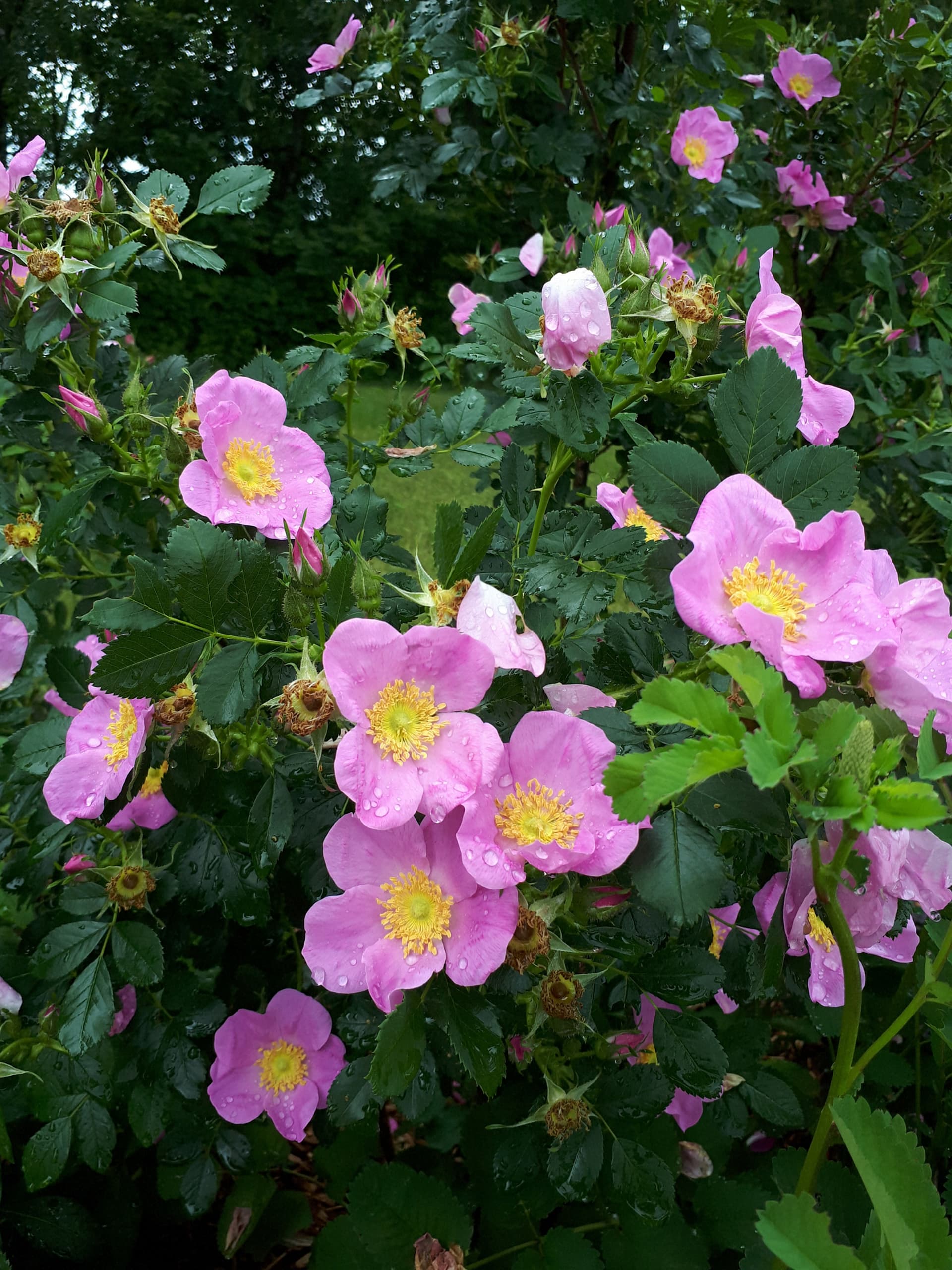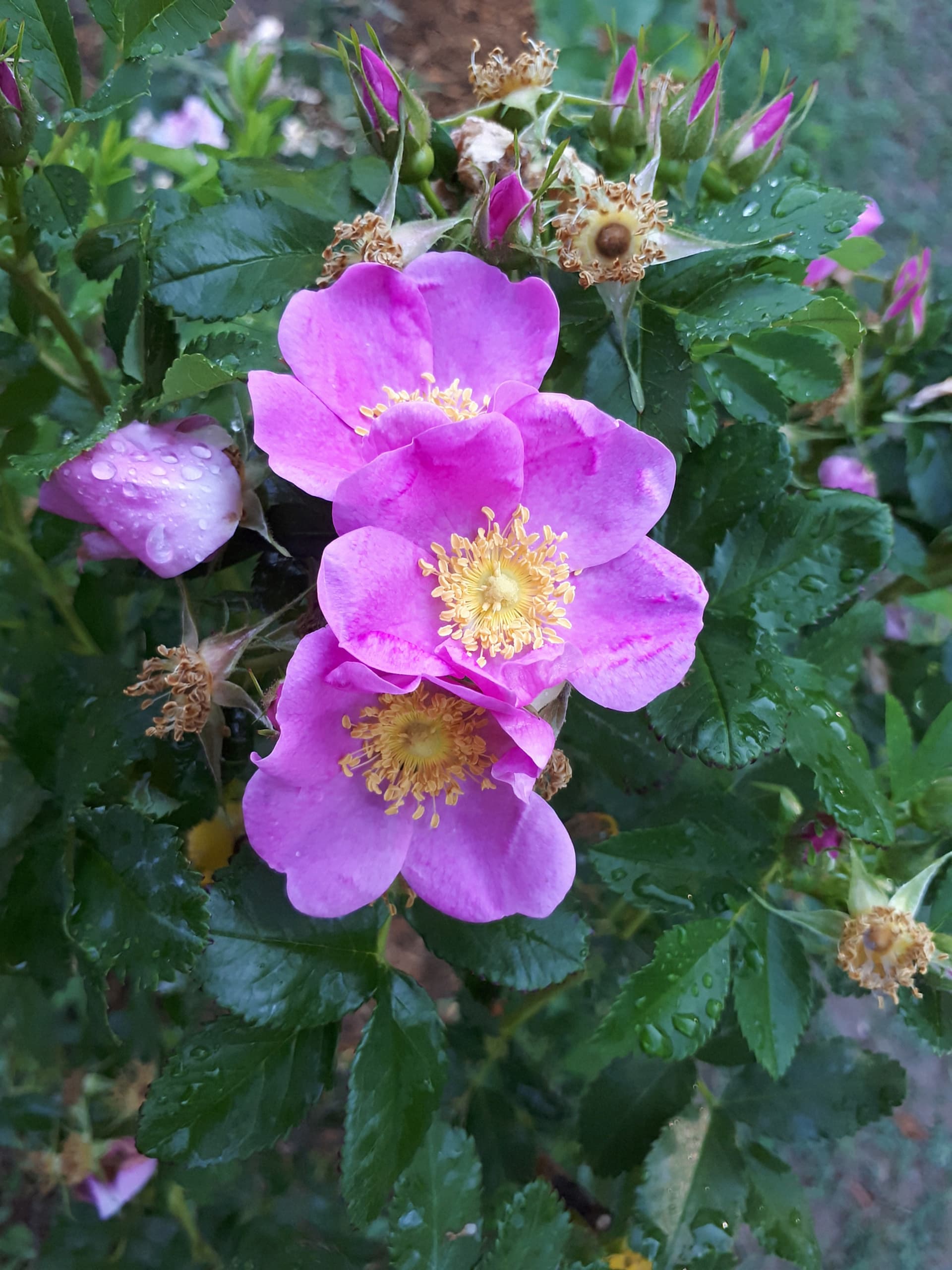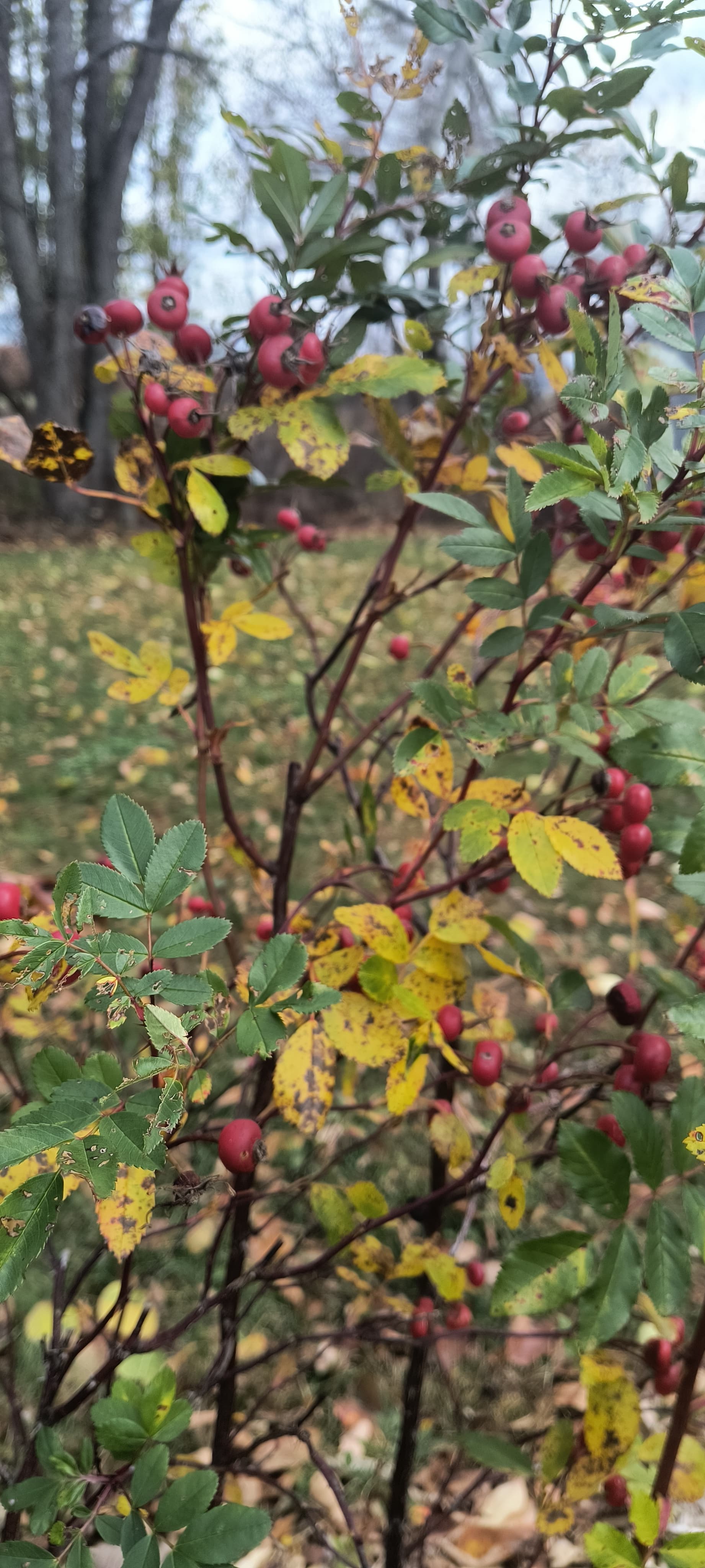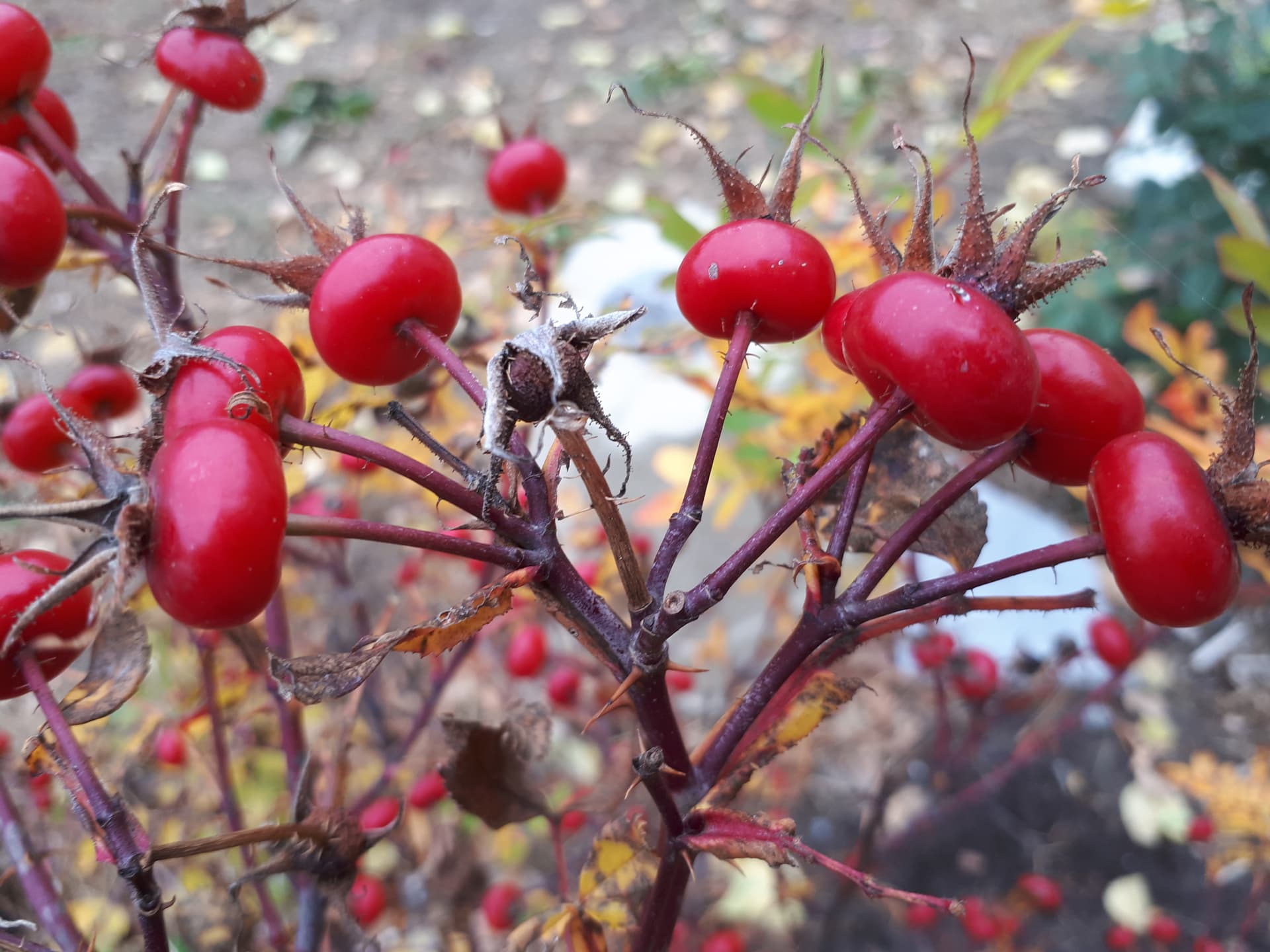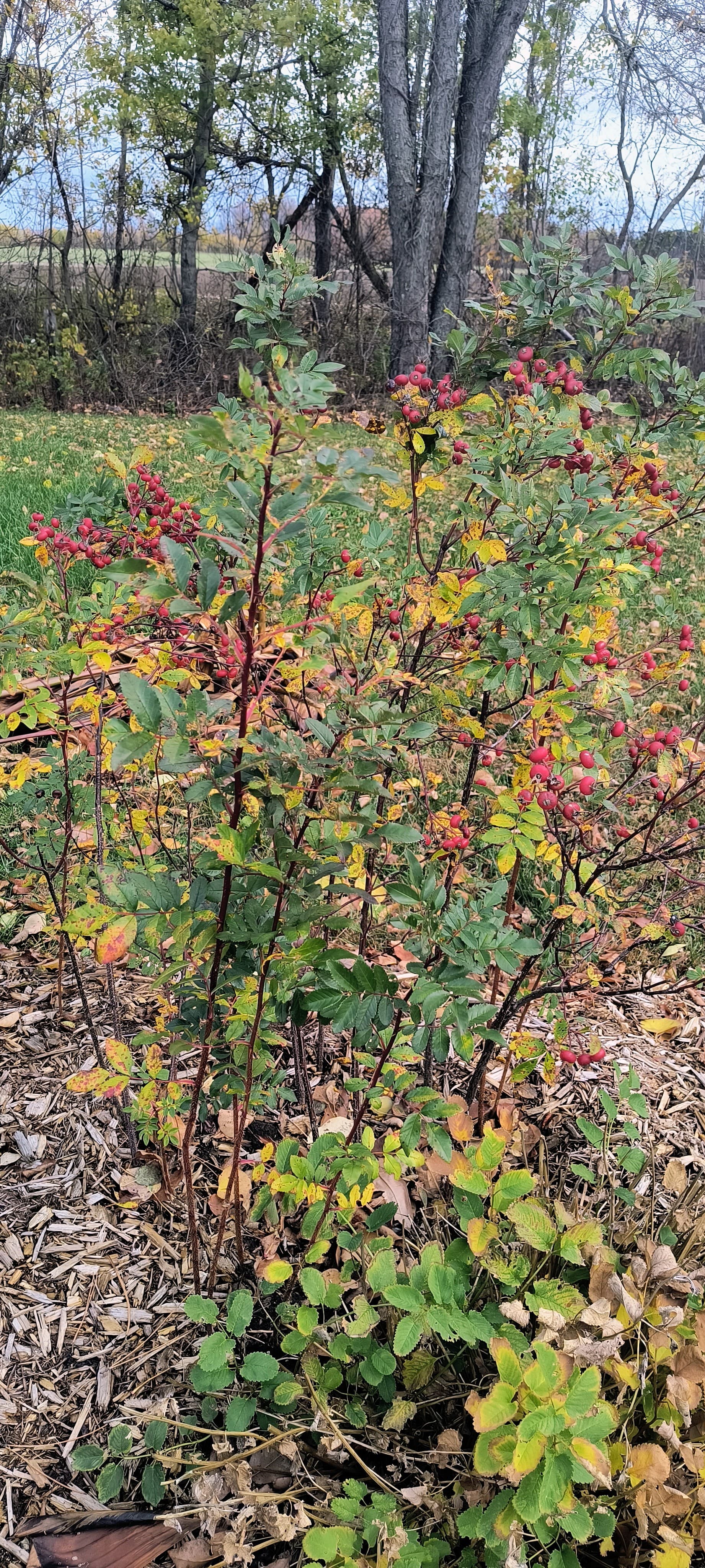 At my first glance, there are a total of four roses on the site, spaced at a certain distance from each other. However, upon closer inspection, one rose shows some differences, as for example, its foliage is not as red and fiery in autumn, it has smaller rose hips, rounder leaves, less shiny foliage, larger corymbs, less scent of blooms etc.