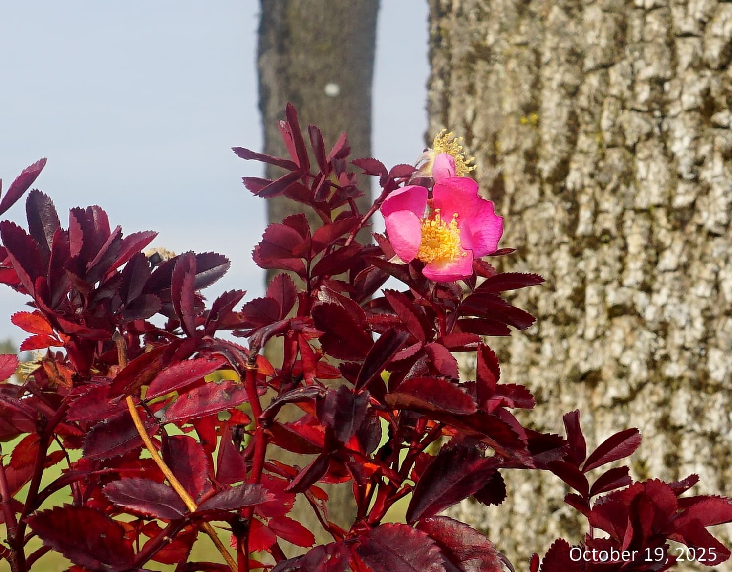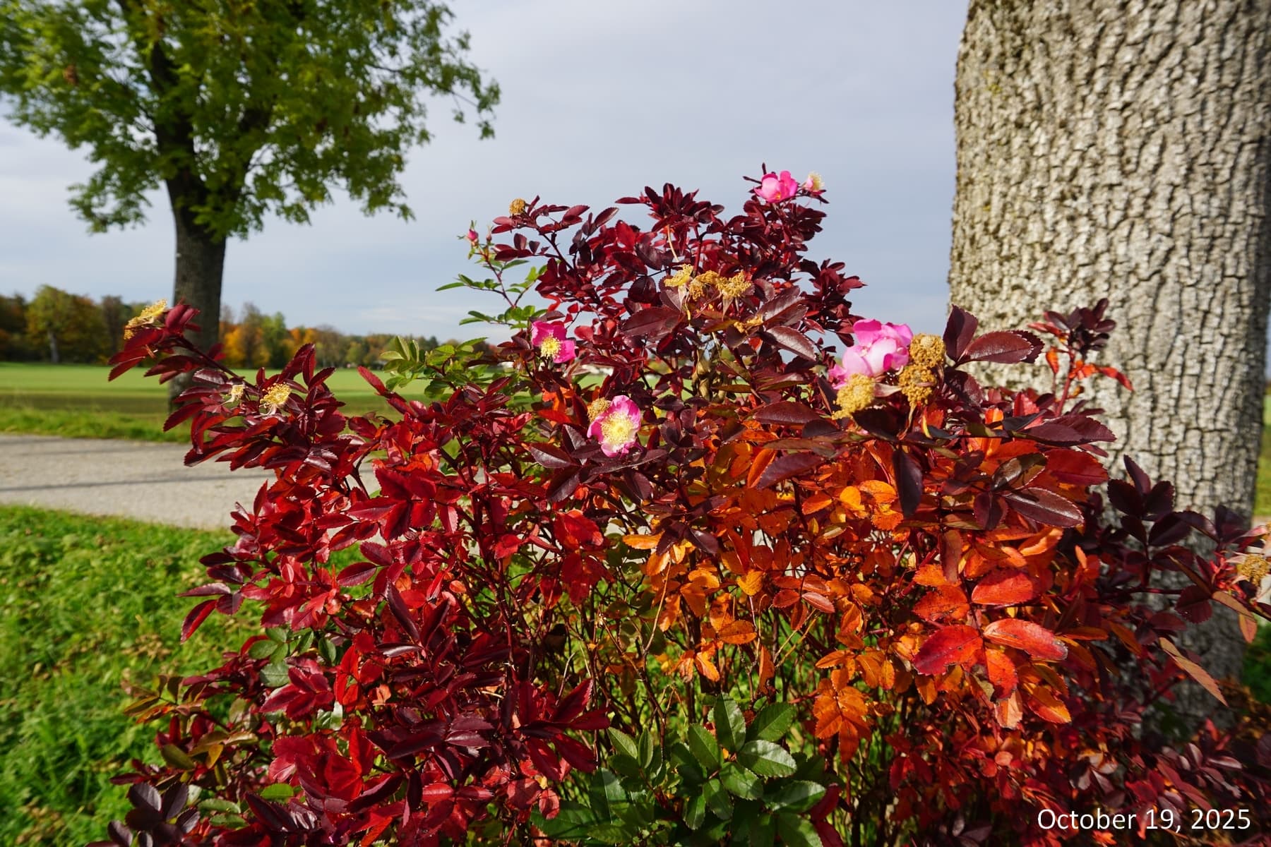 I suspect that the reason for this may be the severe heat waves with periods of heavy rain in sumer 2025, which prevented rose hips from forming. There are none this year. The plant therefore had more resources available, and the relatively mild autumn weather could have activated the stimulus of flower formation even stronger.