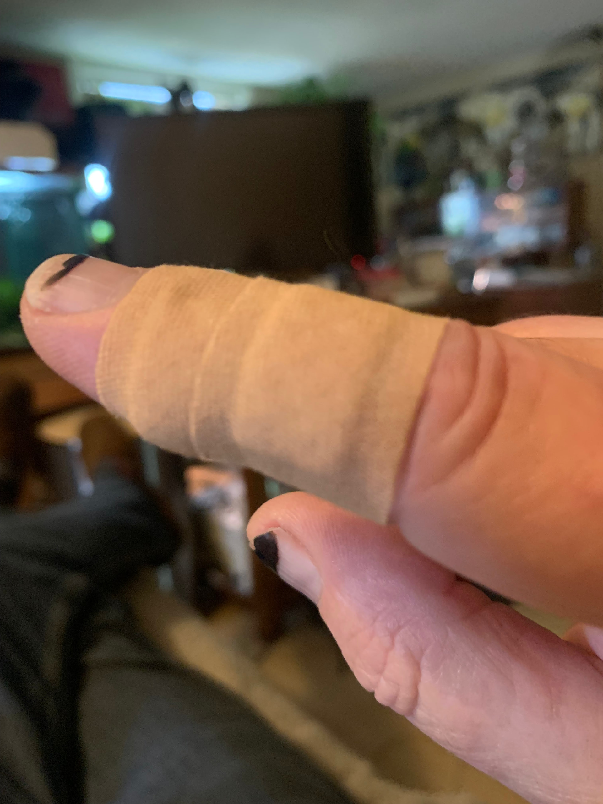 A two bandage problem! Must be quite the gash under there. Which rose was so thirsty for a “blood meal” that it would so thoroughly bite the hand that feeds it? (not Audrey II, hopefully.)
