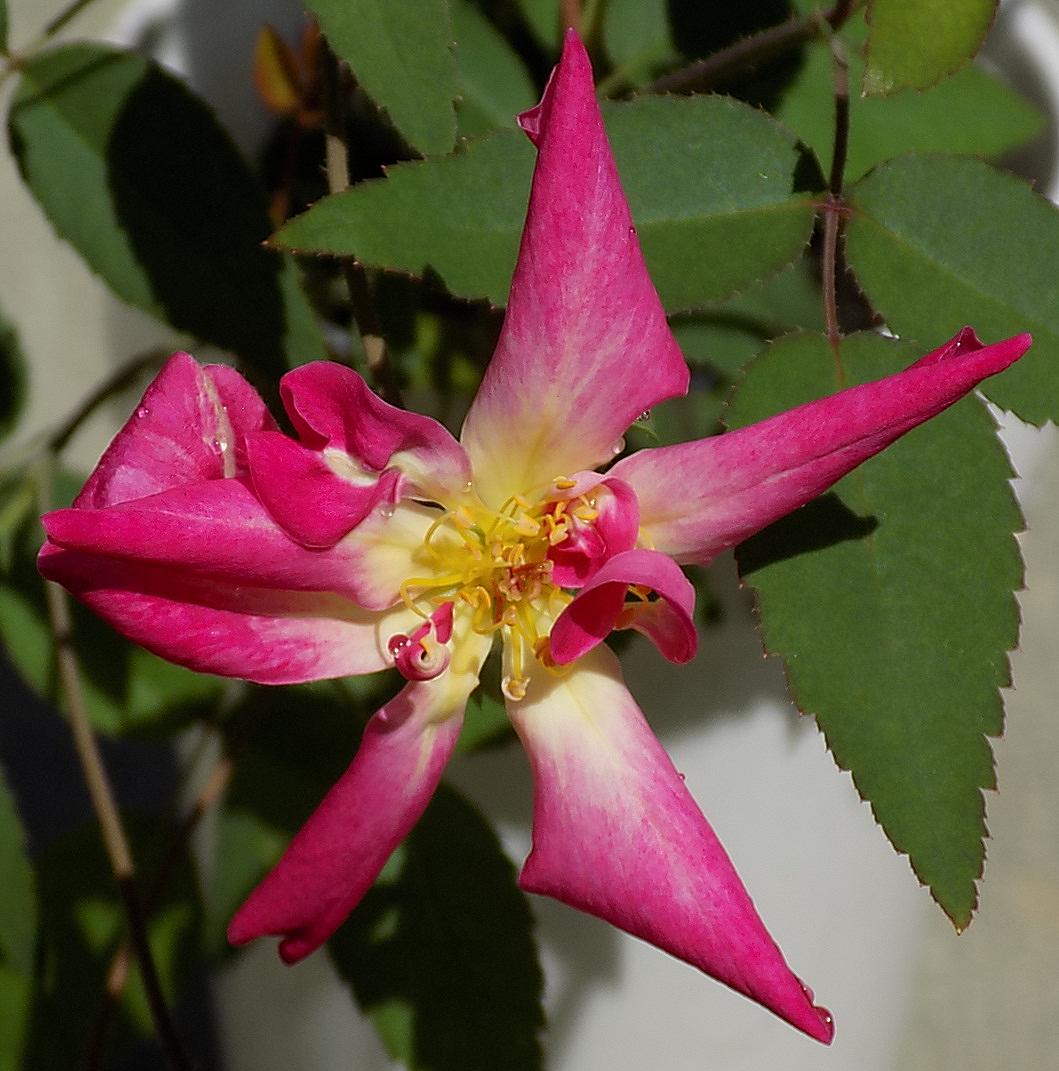 I bought my plant from Vintage under the name ‘Purpurea’. I don’t know whether it is the same rose that ARE sells as ‘Winecup’. Comparing their photos on HelpMeFind, it looks like ‘Purpurea’ has glossier foliage, and ‘Winecup’ has a few more petals, but that might be due to their being grown in different climates.