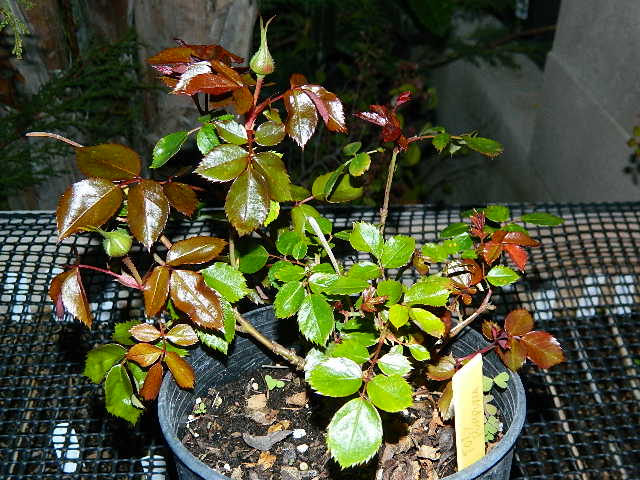 Purpurea (the China from 1930) has deeply colored blooms and is perfectly healthy here. I did a lot of crosses with it in 2009. None of them took. I tried more crosses in 2015. I didn’t get anything from Purpurea pollen, but it set two hips with a grand total of three seeds from Comtesse du Cayla pollen. Two of the seeds germinated five weeks ago. One of the seedlings looked normal. The other one had unusually dark reddish green cotyledons. The tops of the cotyledons look greener now, but I just noticed that the bottoms of the cotyledons and leaves are brick red. The stem is a deep purplish brown, similar to Comtesse du Cayla. I don’t remember Comtesse du Cayla’s leaves being this red on the bottom. I’ll look when Comtesse du Cayla leafs out.