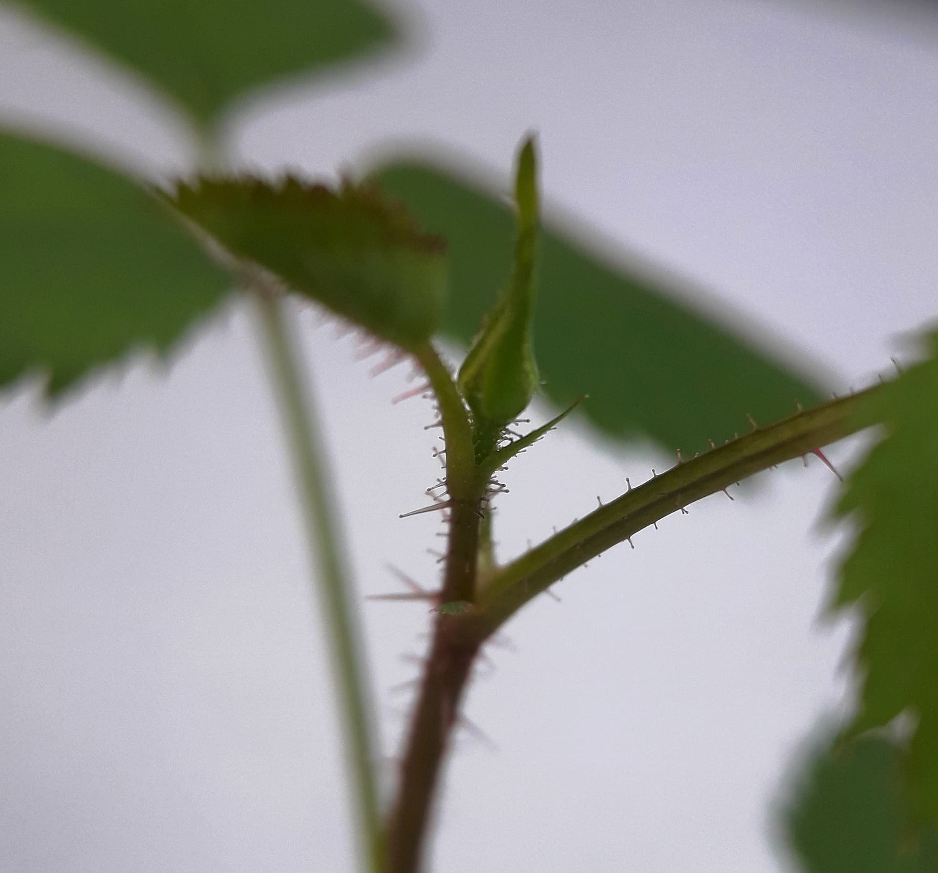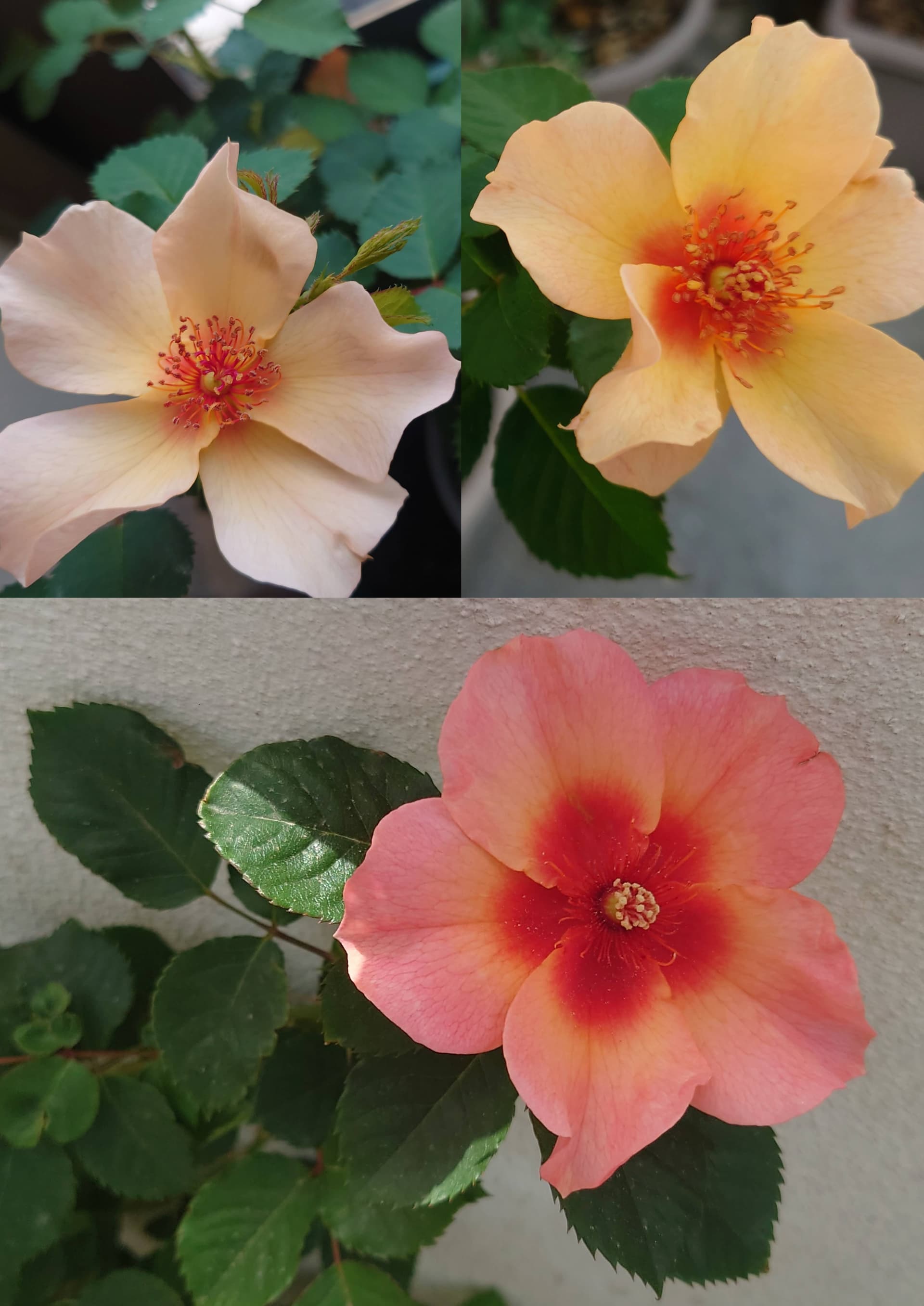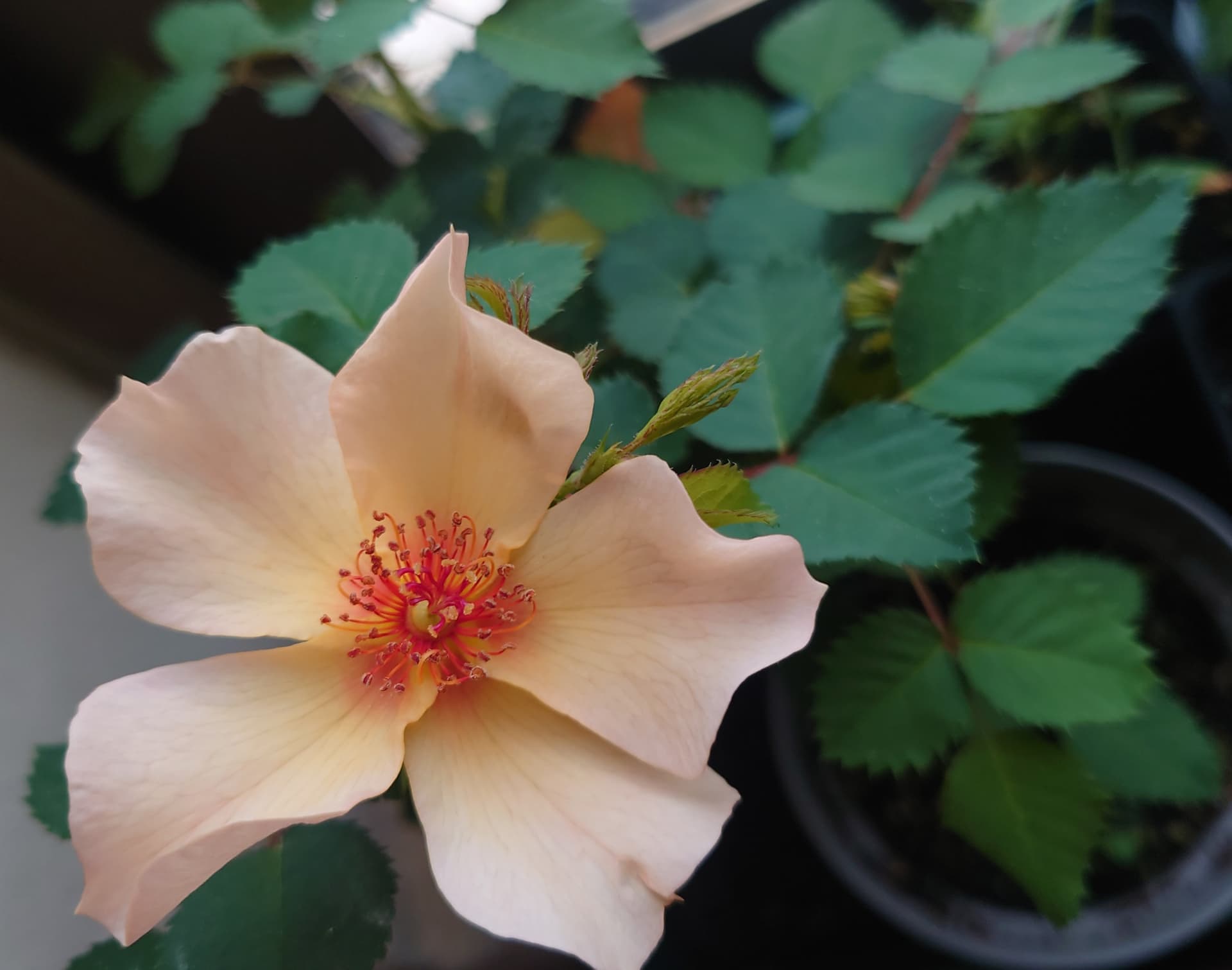 It’s not a big blotch but it’s there, and more blooms are appearing this week. I wasn’t expecting a single from this cross, both parents have more petals, but it might evolve with time. Thorny to the gills, very mild fragrance only and the foliage is barely textured, but I could still work with this. I’ll try to put White Roadrunner pollen on it when it gets a bit bigger. I’m also putting White Roadrunner pollen on last year’s JdL × Raspberry Kiss seedling.