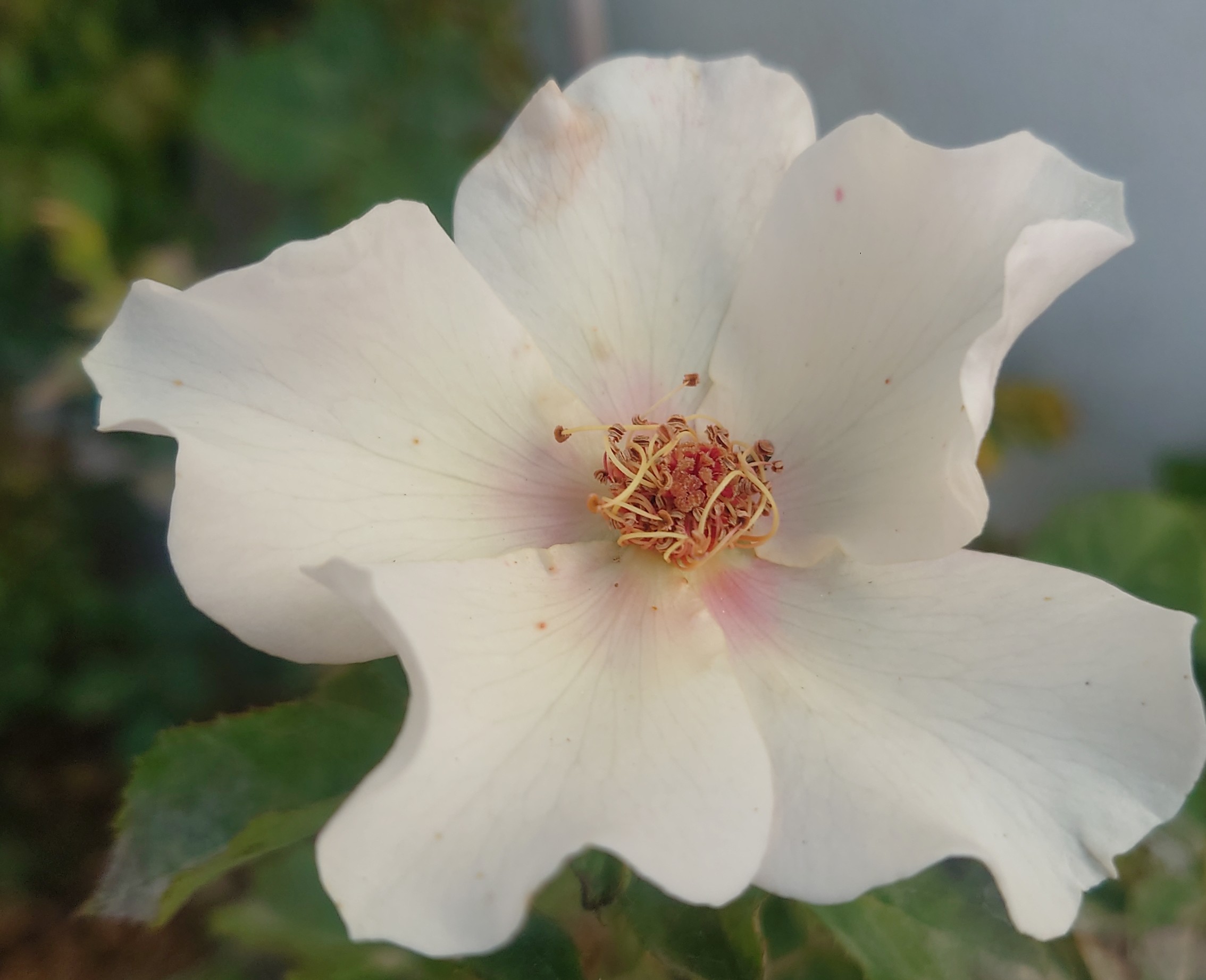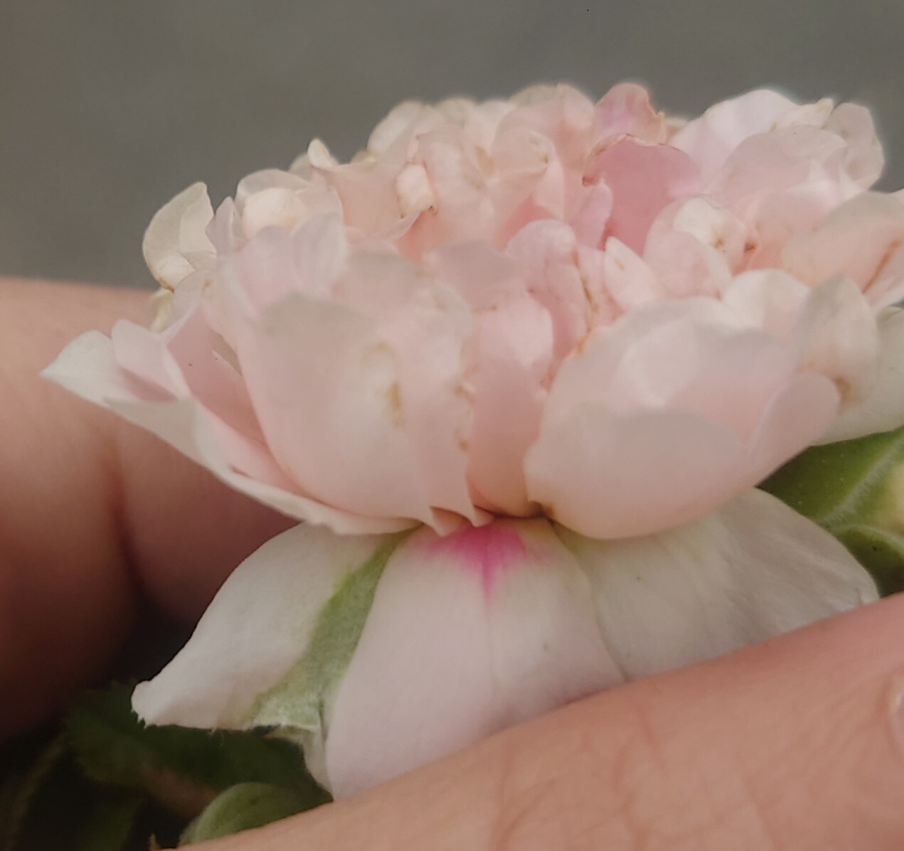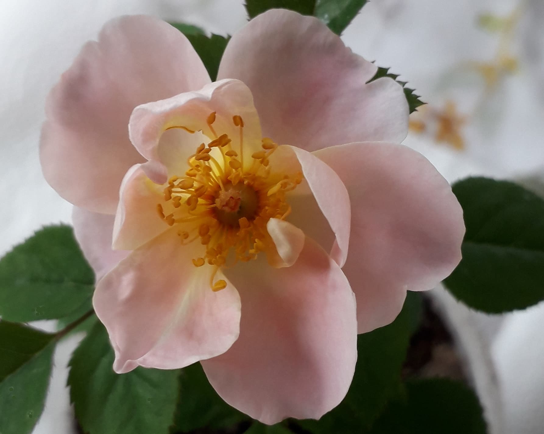 It’s not a big blotch but it’s there, and more blooms are appearing this week. I wasn’t expecting a single from this cross, both parents have more petals, but it might evolve with time. Thorny to the gills, very mild fragrance only and the foliage is barely textured, but I could still work with this. I’ll try to put White Roadrunner pollen on it when it gets a bit bigger. I’m also putting White Roadrunner pollen on last year’s JdL × Raspberry Kiss seedling.