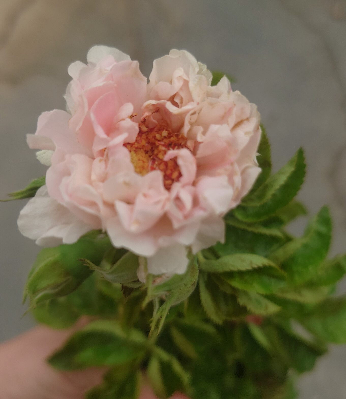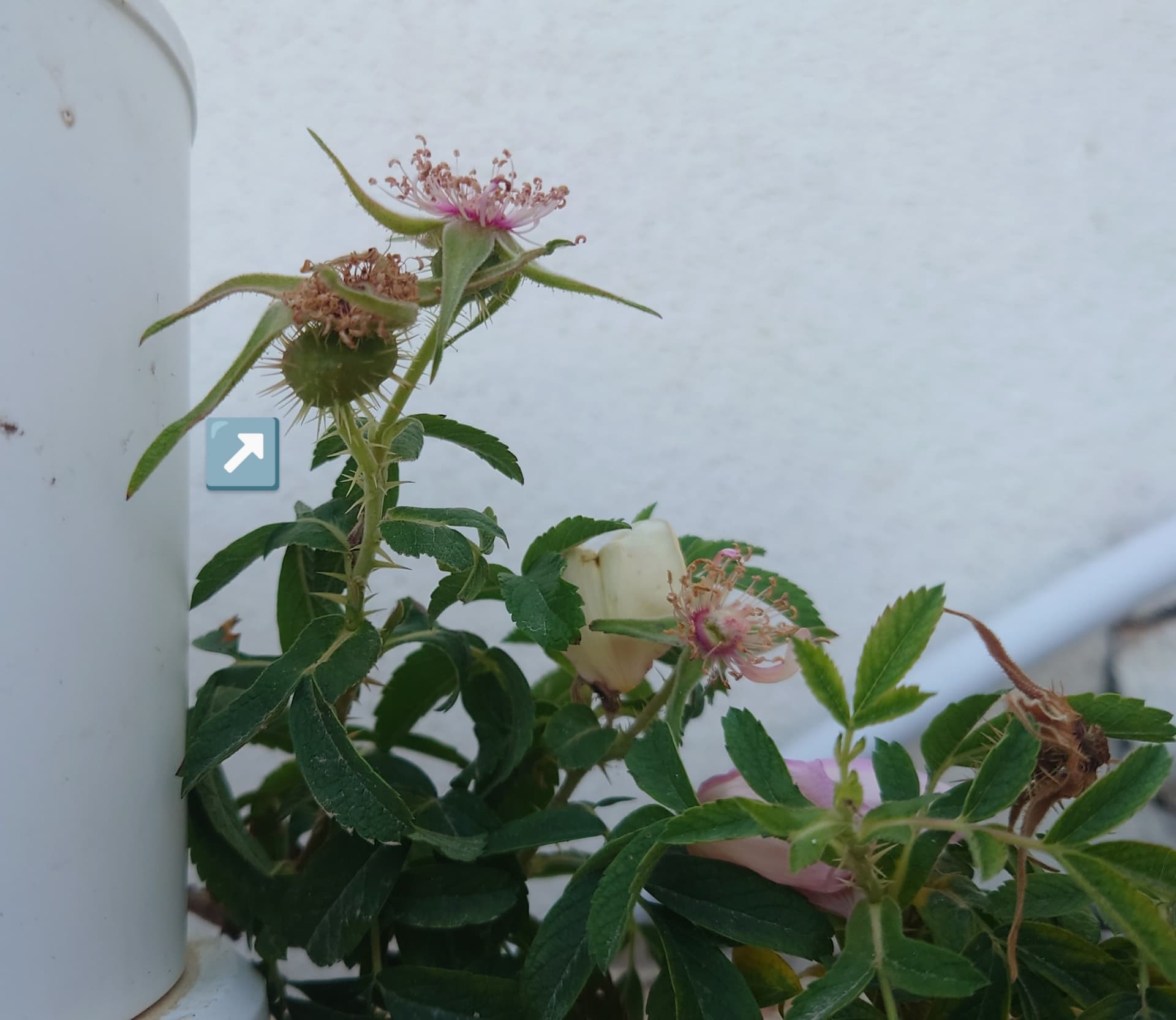 I tried dumping pollen on practically every single bloom Nigel made this spring in vain, except for one branch that had snaked around the back of another pot, and that one branch is where the only hip formed… The irony.