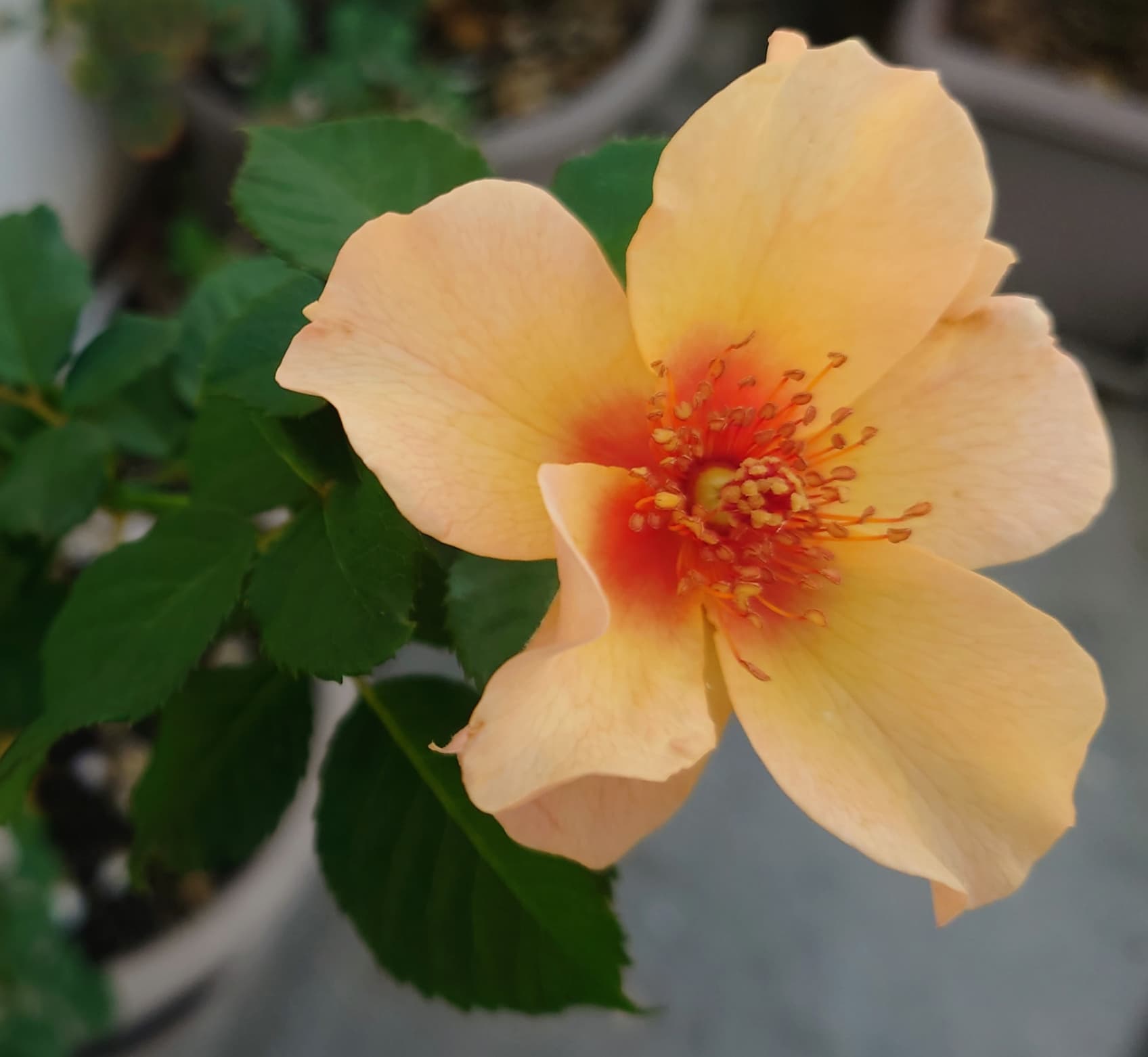 I’ll get back to you as promised regarding the‘Eye of the Tiger’ X Strandperle ® Norderney’ seedling. The first juvenile flower has opened today. It comes in an apricot color, has a strong fruity scent and contains 12 petals. There is also a slight hint of a blotch. It remains to be seen whether it will intensify as it progresses.