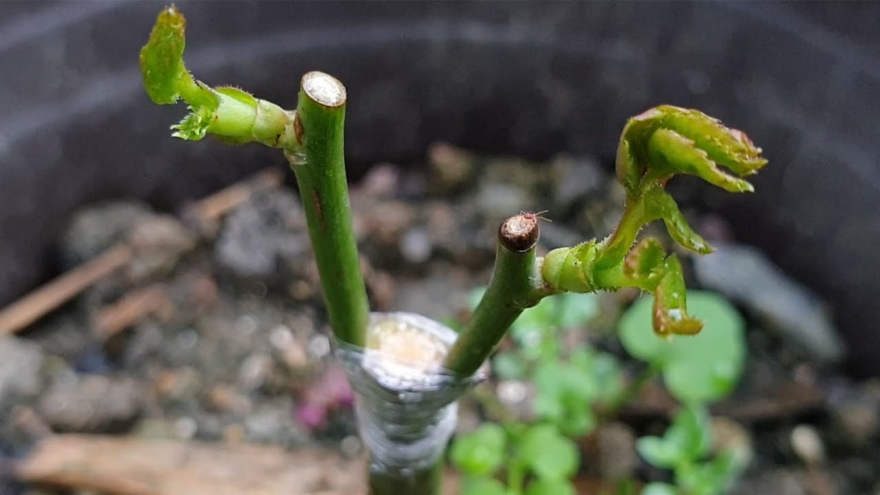 shoving a freshly trimmed “wedged end” clipping of the desired rose (scion) into the rootstock.