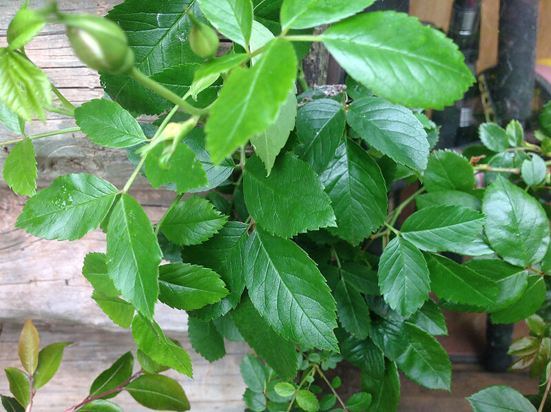 It was one of the first roses I ever grew and I have only kept one cross pollinated seedling from my work with it . This seedling (cross with a modern purple tetraploid) has acceptable winter hardiness but has a couple other desireable traits…a more complex color and importantly a larger number of buds per flower cluster. It has retained the smooth red stem trait. Theoretically it should be a triploid. Even when used as the pollen parent, Therese Bugnet’s distinctive foliage dominates this seedling.