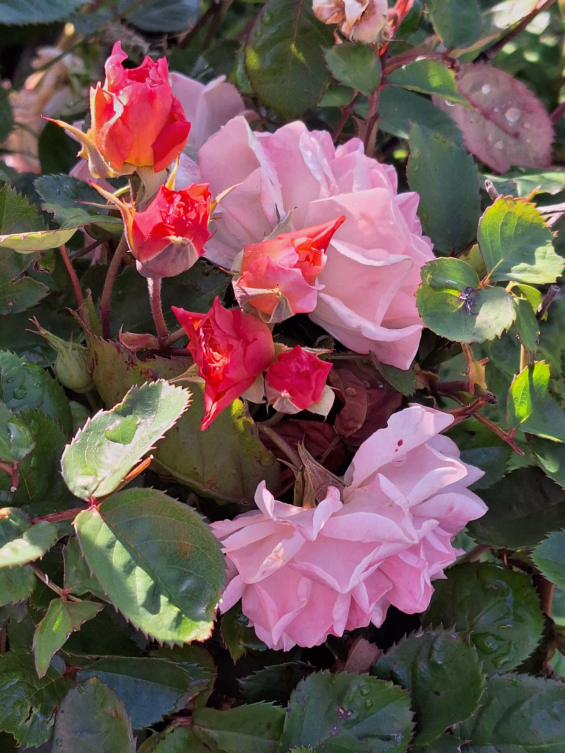 Other observations today, the tight red buds transition through a tangerine phase, the leaves are quite toothed, petal count is 35 and, sadly, it does have a black heart…