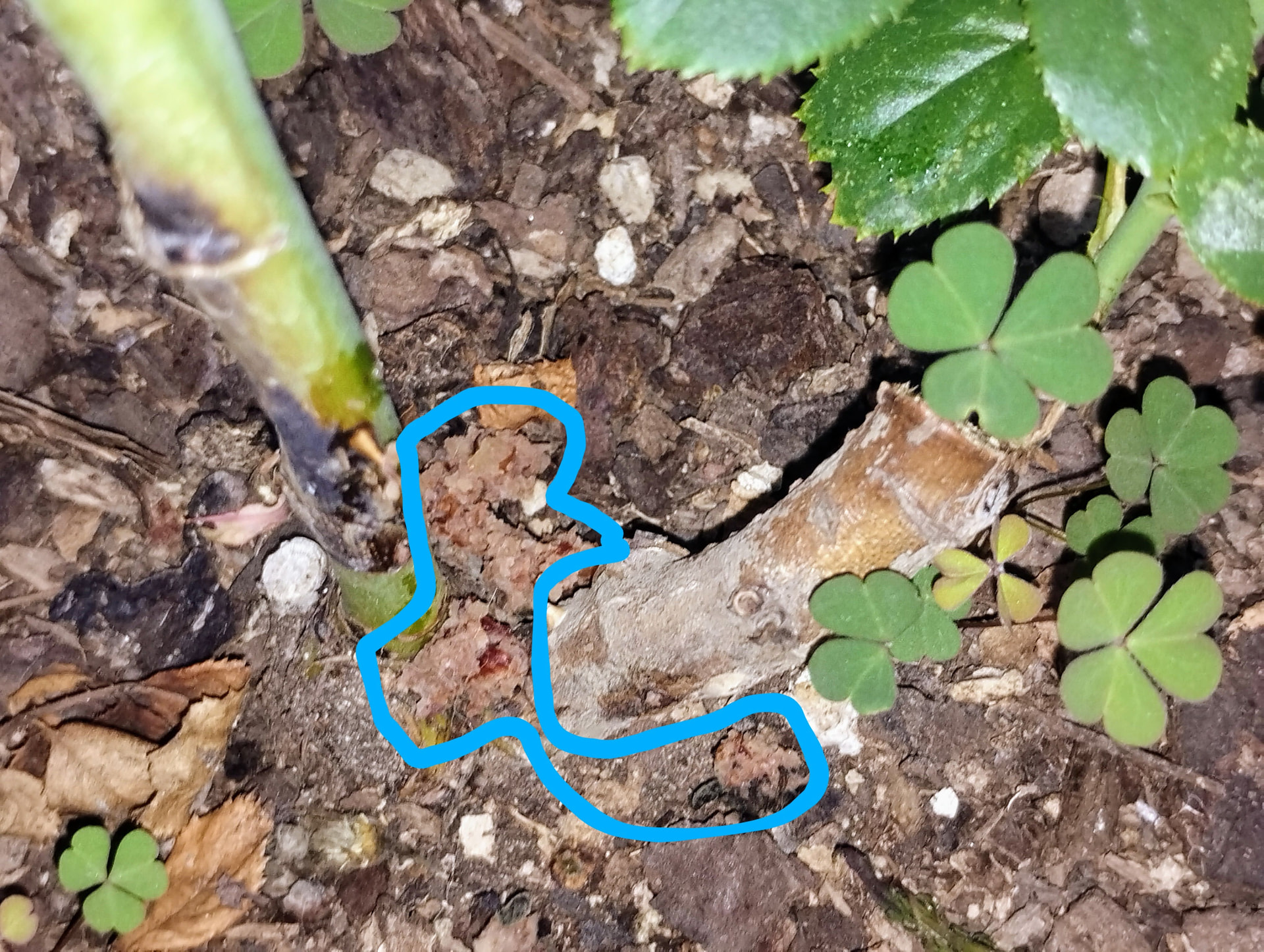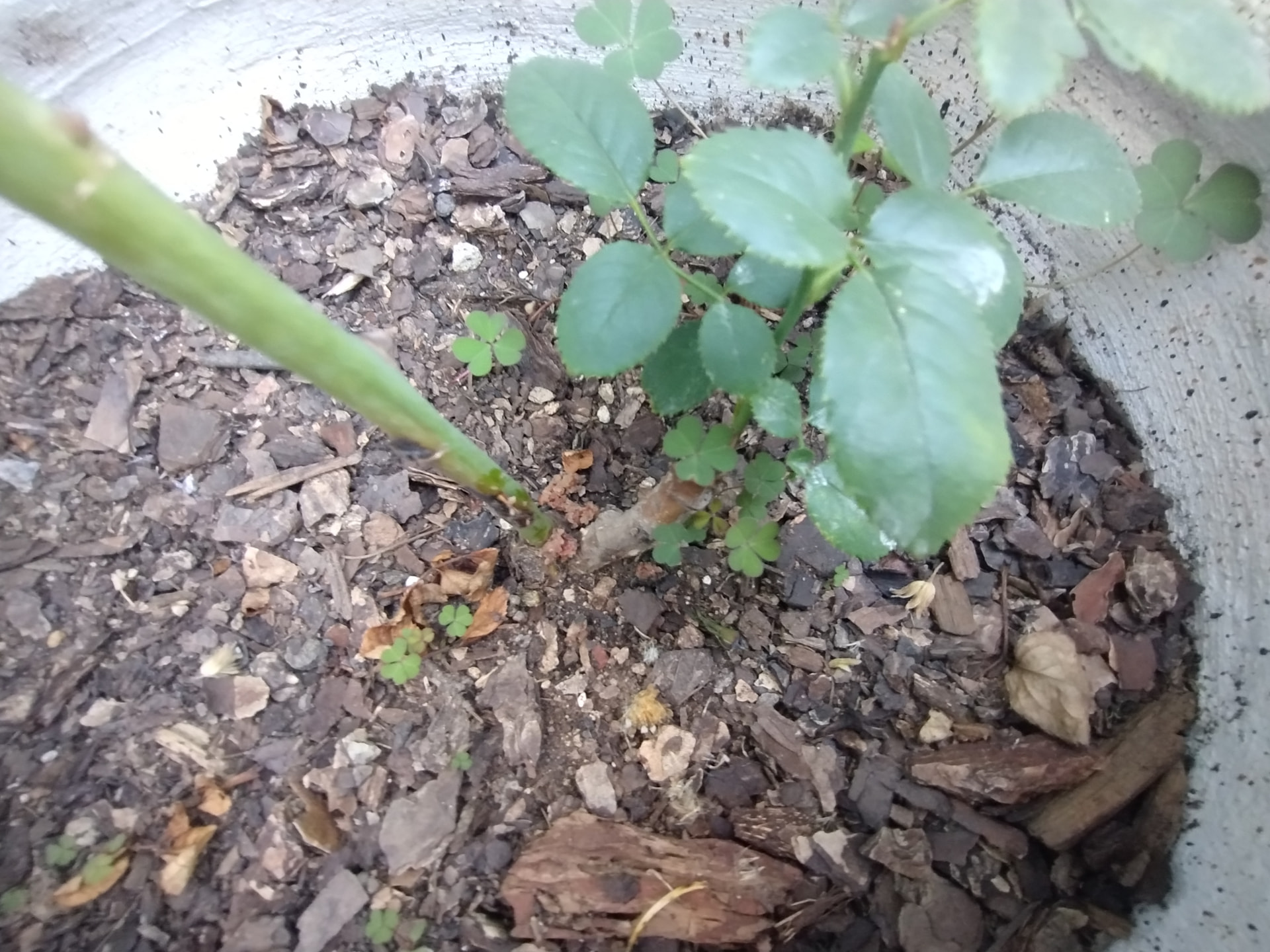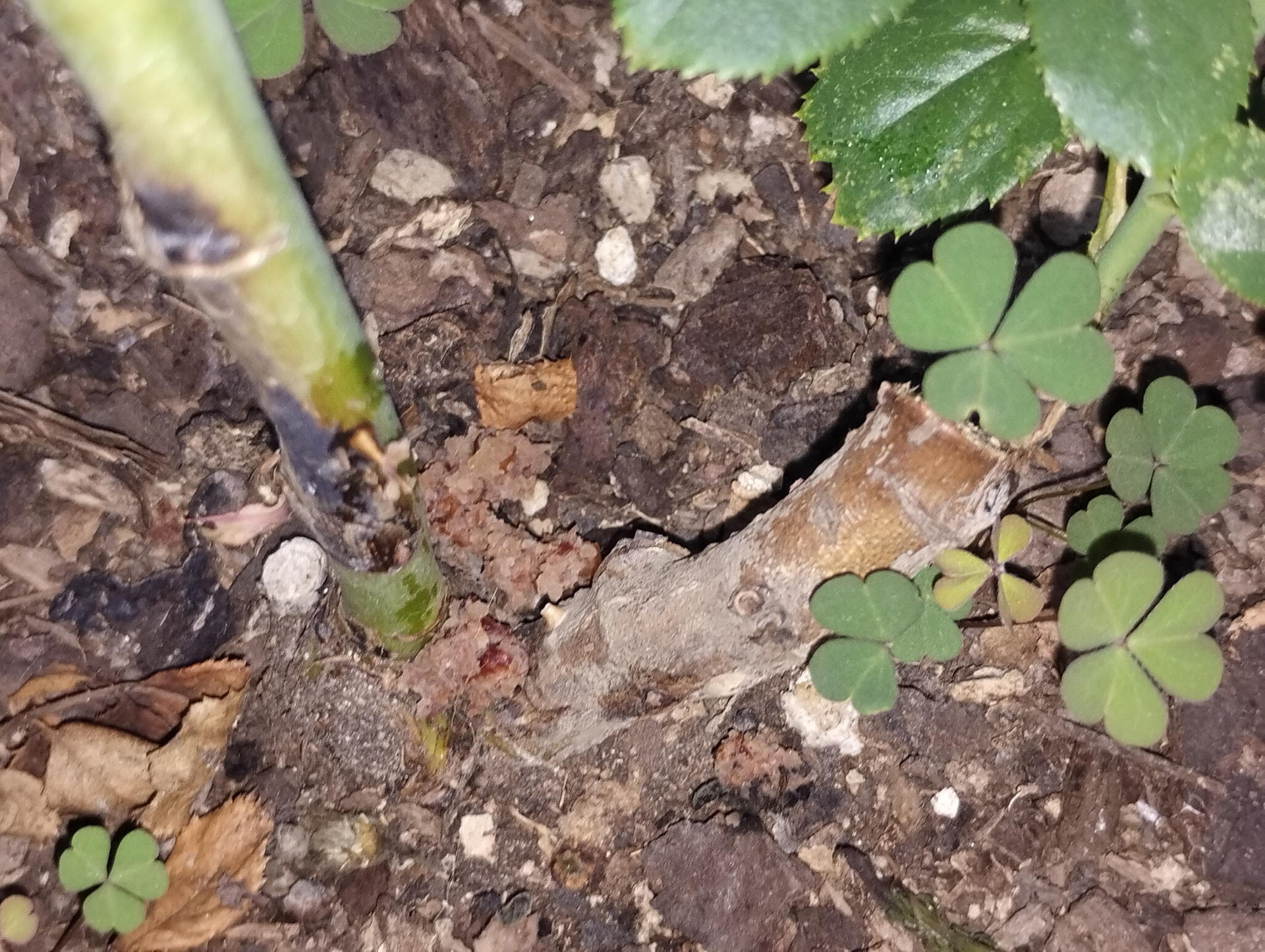 This is growing at the base of a rose that was badly sunburnt back at the end of summer and appears to be making a promising recovery, with a lot of new growth farther up.
